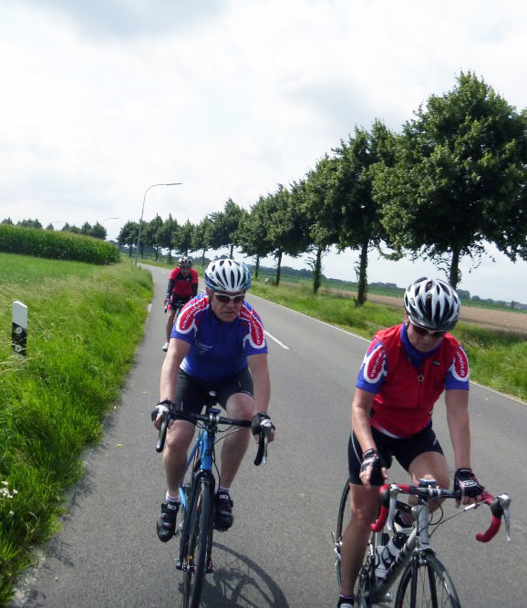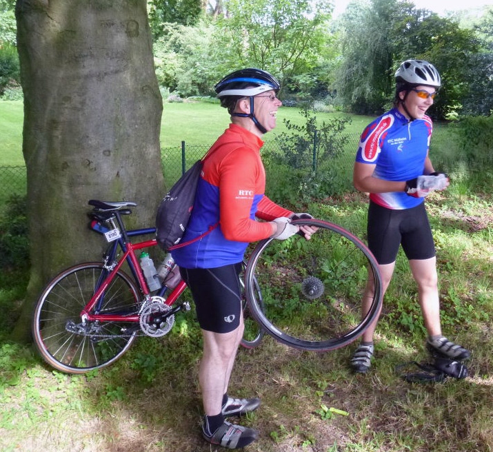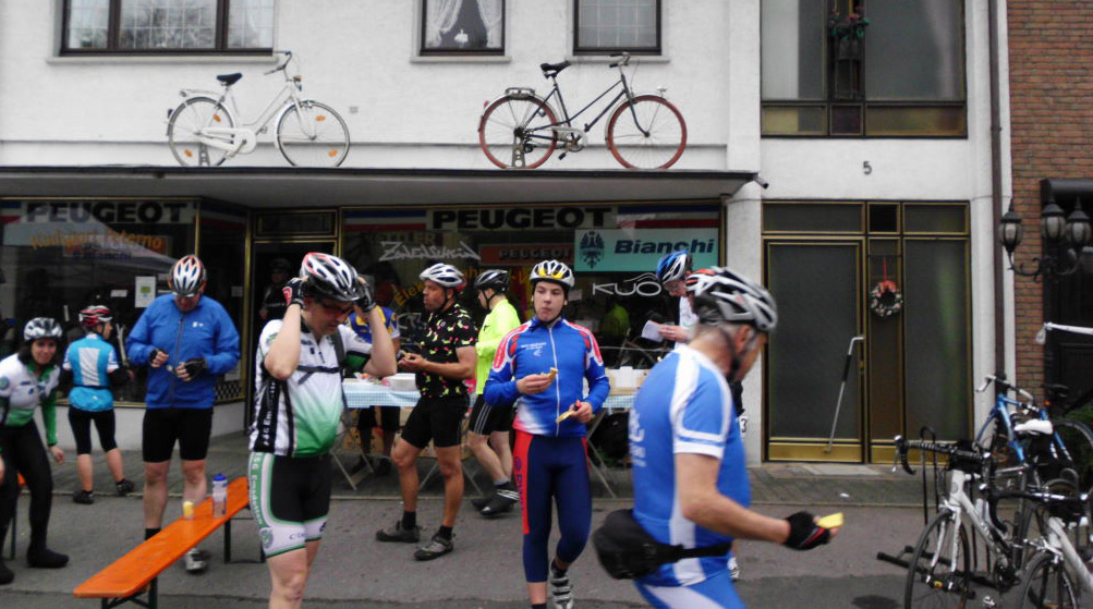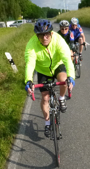 Für den Sonntag war besseres Wetter angesagt, also fanden sich sechs Pedalritter am Treffpunkt. Locker ging es im Sternfahrtmodus nach Dinslaken. In Dinslaken trafen wir noch zwei RTC-Kollegen, die im Auto angereist waren. Einige wählten die 40er, andere gingen auf die75er Runde. Roland und ich hatten auch die 75er im Programm und nahmen uns ein zügiges Tempo vor. Unterwegs trafen wir noch auf Friedhelm, es ging schnell zu dritt weiter. Friedhelm hatte sich sogar eine schnelle 115-er Runde vorgenommen und so trennten wir uns dann wieder. Eine Panne mit Glas auf dem Radweg hielt uns auf. Radwege sind, wenn man sie benutzt, gefährlich für Rennradreifen. Nach dem das Glasfragment aus den Reifen gepult und der Schlauch gewechselt war, ging es weiter. Im Ziel trafen sich dann fast alle wieder. Nach verdientem Kaffee und Kuchen ging es wieder heimwärts. Im Fahrtenbuch standen 120 km und rund 400 hm. TT