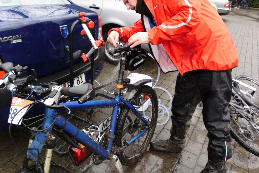 Highlight des Tages wurde dann die "Self-made" Raddusche. Um der endlosen Schlange am Waschplatz zu entgehen, setzte ich erstmals das TT-Spezial-Fahrrad-Waschsystem ein. Der Testlauf verlief zufriedenstellend. Ab sofort sind uns Matschwetter und dreckige Mountainbikes total egal !