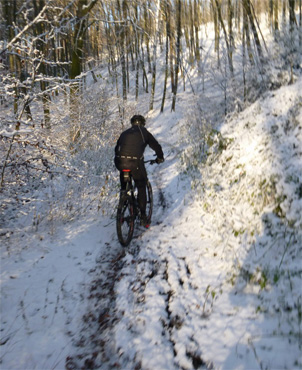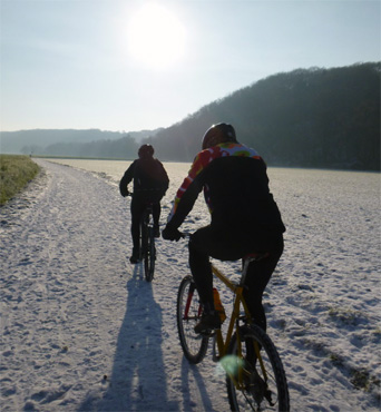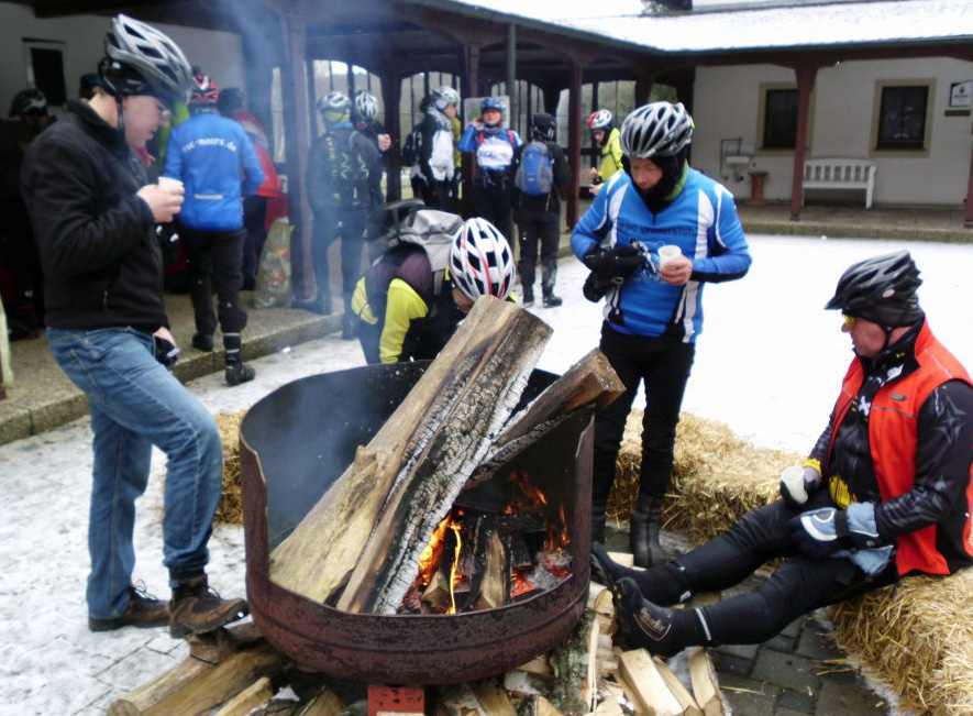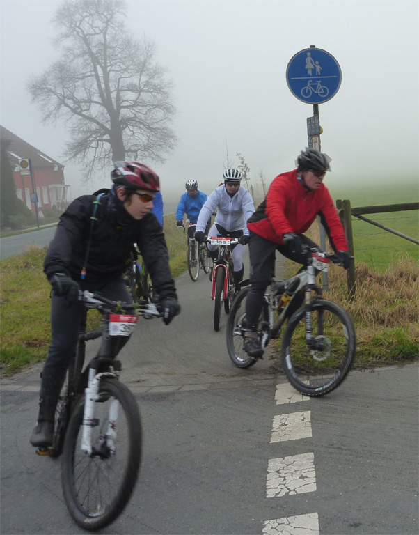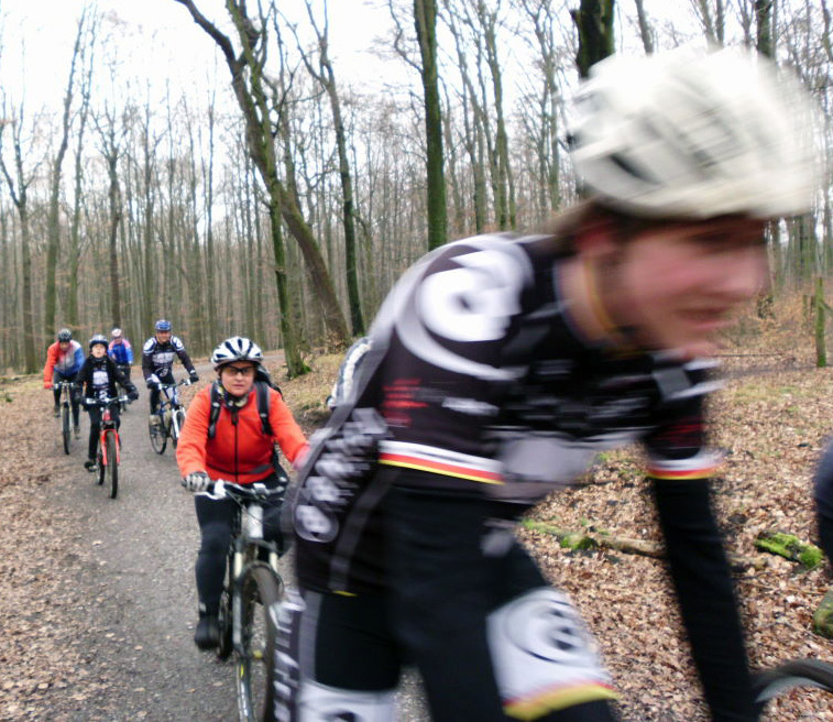 Die Runde hatte doppelten Reiz, denn nach Wochen eisiger Kälte waren Plusgrade und sogar Sonnenschein als Begleitung auf einer gut geführten Strecken mit ein paar Höhenmetern angesagt. Ohne die Gefahr Erfrierungen an Händen oder Füssen zu erleiden, machte Radfahren mal wieder richtig Spaß und wir traten recht munter in die Pedale um Anstiege und Schlammpassagen zu passieren.