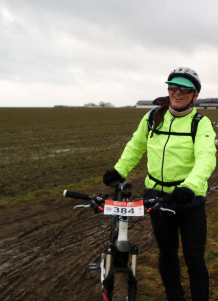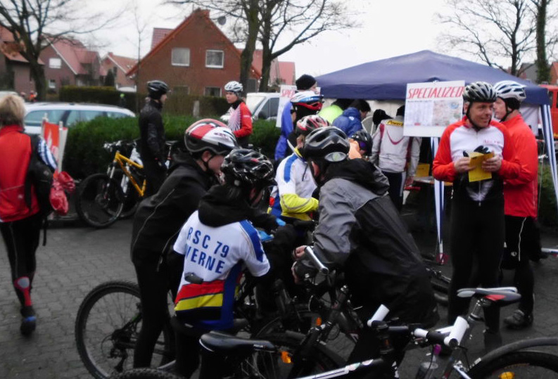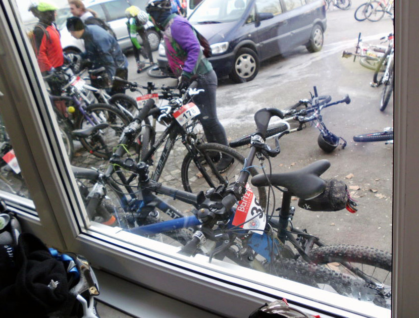 Im Vergleich zur Capelle-Tour war es erfreulich trocken (von oben), aber die Strecke -etwas welliger als Capelle- präsentierte sich immer noch reichlich schlammig, mit zahlreichen feuchten Wegstücken. Ärgerllich, wenn dann das Schutzblech in der Garage Urlaub macht. Bis auf Rainers kleinen Ausrutscher in einer der letzten Schlammpassagen lief es rund und nach 2:41 h waren wir wieder im Ziel. Klar, hier war es wieder rappelvoll und die Schlangen waren lang - vor der Kartenausgabe, am Getränkestand, an der Kuchentheke. Dennoch konnten die nötigen Belohnungen organisiert werden und auf dem Heimweg strahlte sogar wieder die Sonne.