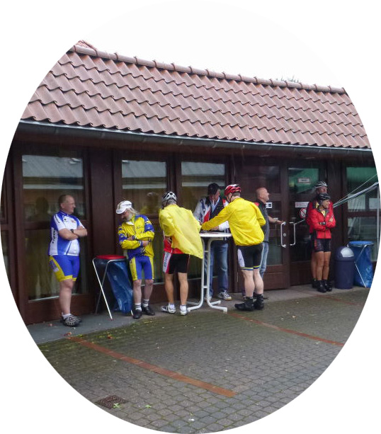 Friedhelm und Thomas standen ganz alleine am Treffpunkt. Es regnete leicht an diesen Morgen. Lange warten wollten wir nicht, deshalb fuhren wir pünktlich los. Der nicht so laue Mairegen begleitete uns auf der ganzen Tour. Wir fuhren auf Abschnitten der RTF Strecke zum Ausrichter. Es war sehr ruhig an der Wuppertaler Anmeldung. Das Wetter schreckte also nicht nur die Vereinskameraden, sondern auch noch viele andere Radler. Ein warmes Bett und ein ausgiebiges Frühstück, war für die Mehrzahl der Sportler, die wohl attraktivere Alternative.