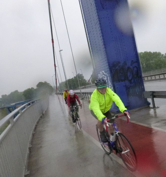 3 RTCler waren am Treffpunkt. Gutes Wetter ( warm, sonnig und trocken) war bestellt und wurde sogar geliefert. Wir fuhren gut gelaunt nach Düsseldorf. Die Spuren der letzten Querung waren noch frisch, also kaum Anlass zu kontroversen Diskussionen. Vor Ort trafen wir noch eine Gruppe des RTC, die etwas gemütlicher unterwegs waren.