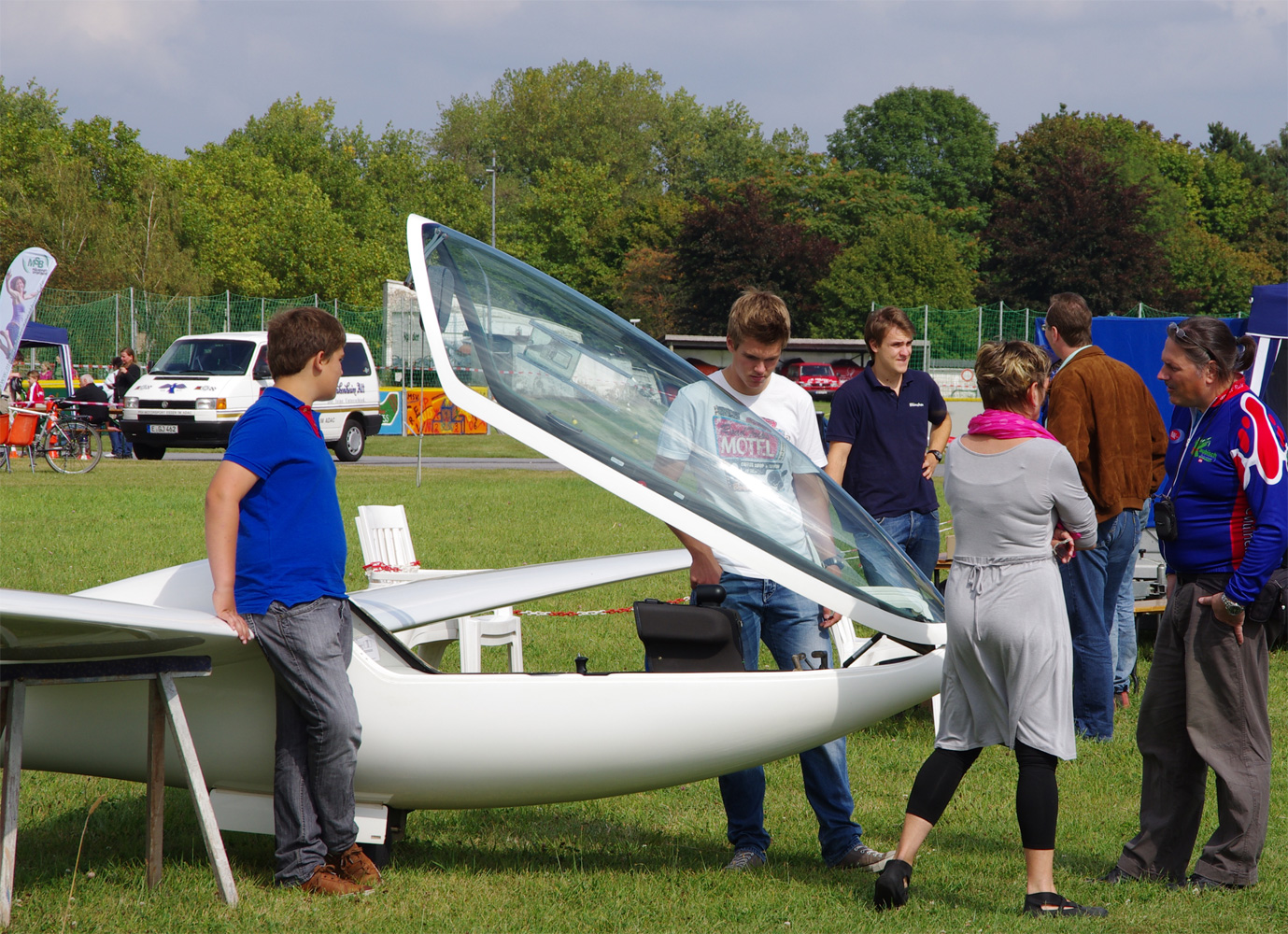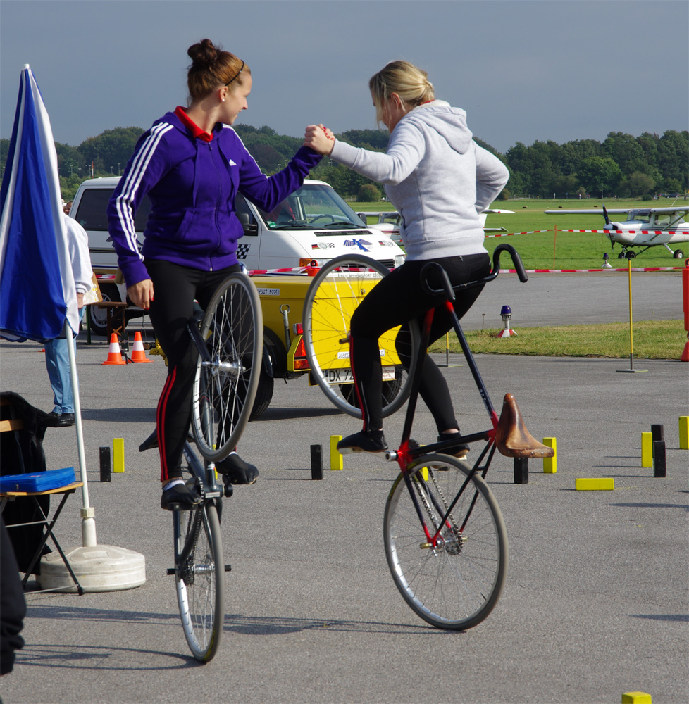 Kanalrunde nach Waltrop Das Wetter stimmte, die Strecke ist immer noch rustikal und ein wenig staubig, nur die Teilnahme war etwas dürftig. Klaus T, Gastfahrer Heinz und Klaus M. trafen sich in Oberhausen am Schloss und begaben sich auf die traditionelle Sternfahrerreise nach Waltrop. Friedhelm und Mani hatten sich den Schlenker über Oberhausen eingespart und wir trafen sie unterwegs auf der Strecke. Die Emscher-Radweg/Kanalstrecke ist natürlich topfeben – es sei denn eine grosse Querstrasse (z.B. die B224) muss überwunden werden, aber für das nördliche Ruhrgebiet ist die Strecke bei schönem Wetter die Reise wert, sie ist autoverkehrsfrei, nur ab und an muss man mit Joggern oder Hundebesitzern teilen und die eine oder andere Attraktion – seien es die schicken Brücken, die an Drahtseilen den Kanal queren oder die Zeche Nordstern, werden auch noch geboten. In Waltrop ist der Start- und Zielort bei schönem Wetter sehr nett und lädt zum Klön mit Kollegen ein. Nach Verzehr von Kaffee und Kuchen ging es wieder heimwärts. Gegen den Wind und irritiert durch zahlreiche Baustellen war der Rückweg etwas anders, aber bis zum Weizenbier in Oberhausen lief es recht gut. Bei 125 km auf dem MTB-Sattel leidet das Sitzfleisch geringfügig und freut sich auf einen lockeren Nachmittag – aber so ist sie eben, die Reise nach Waltrop ! KMSport-Event auf dem Rollfeld Die Einkreisung des Ziels Wegberg mittels GPS