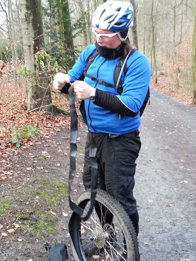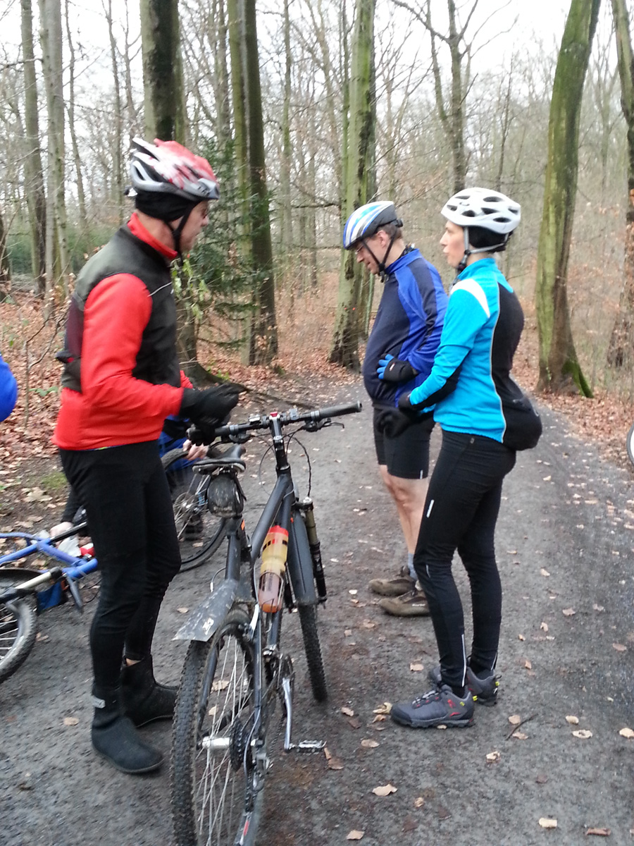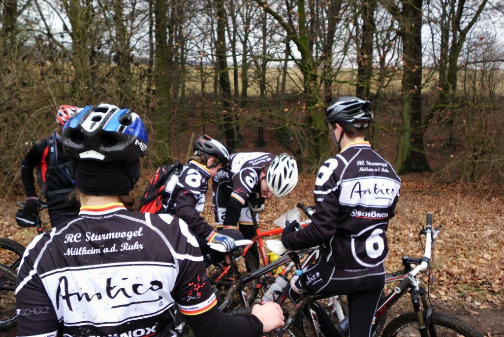 Mülheims Mountain-Biker boten das Basis-Kontingent auf: Friedhelm, Otti, Rainer, Thomas. Felix und Klaus waren vor Ort und drehten die kühle Runde. Die Strecke ohne Schnee ist vielleicht weniger attraktiv, dafür sind die Zehen ziemlich schnell eisigkalt und wir entschieden uns unterwegs für die mittlere Strecke - die ist aber auch durchaus schön. Felix macht unterwegs den alternativen Rundflug, der Versuch, eine Dellle per Spung zu überwinden, endet bei quergestelltem Vorderrad mit einem Salto Mortale. Zum Glück rappelte sich Felix schnell und unverletzt auf - nur der Helm war hinüber und hatte ein Kilo Mutterboden aufgenommen. Die Schutzfunktion des Helms war jedenfalls unverkennbar.
