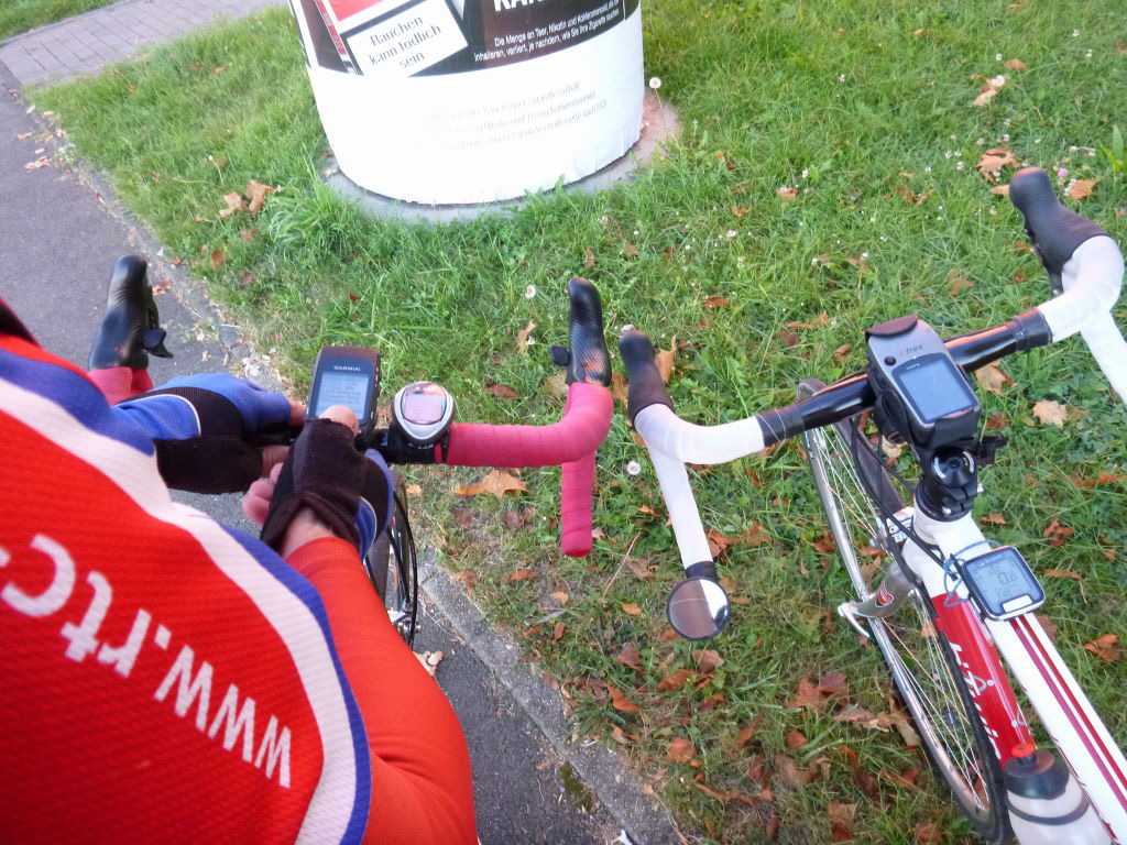 auf die 47 km Runde, da Wuppertal schon ein paar Bergkörner gekostet hatte und wir hatten Glück: Wir folgten einer grossen Bikergruppe, die den GPS-Track auf meinem Garmin verliessen und bei so vielen Bikern vor uns, hielten wir das für eine Abweichung von der Planung. Wie wir schnell feststellten, war dem nicht so, aber mit Hilfe des Garmin korrigierten wir und bogen kurze Zeit später wieder auf die Strecke ein. Nach knapp 10 km waren wir dann wieder am Start. Soviel Abkürzung war natürlich nicht hinnehmbar, also gingen wir erneut auf die Runde.