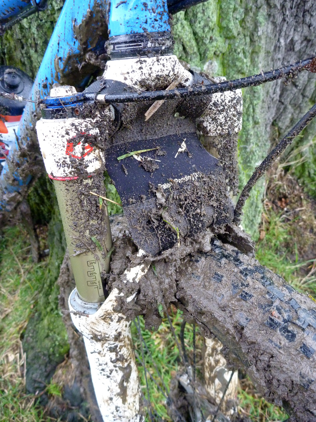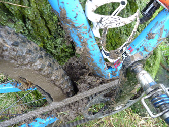 Geläuf, bringt aber nicht vorwärts. ZurWahl stehen zwei tiefe braunglitschige Spuren, rechts und links des Weges, in der Mitte ist eine Grasnabe zu ahnen, die aber genauso tief ist, wie die Spur rechts oder links, nur die Räder sind besser zu erkennen. Die Mocke zieht sich klebstoffgleich am Rad nach oben und wird an Rahmen und Gabel abgestreift, sammelt sich an allen Ablagen, die ein |