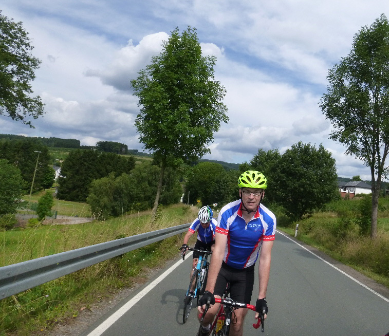 Wir waren dann noch zu Dritt, Thomas, Jörg und Klaus. Jörg hatte heimlich Pfadfinderrunden gedreht und wir folgten seinen Spuren. Bei Müller Menden ging es links/rechts und dann kurbelten wir uns gemütlich zum Flughafen hinauf. Am Gartencenter wurden Pflanzen ausnahmsweise mit Gesangseinlage verkauft und es war rappelvoll. Wir zogen weiter: Wetterstation, an der Sternwarte links, ab ins Tal, rechts Richtung Ruhr und mittendrin links und den Berg rauf. Giftig, aber irgendwann ist oben und Thomas war sicherheitshalber auf halber Höhe einem dringenden Bedürfnis gefolgt.