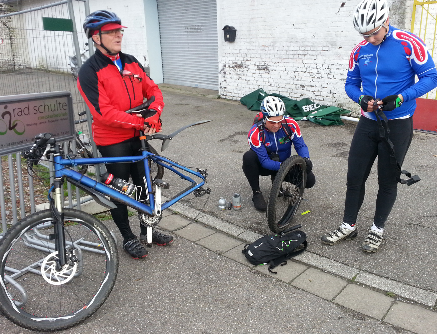 Die Hinrunde blieb kühl, was sich besonders an den Füssen niederschlug, Klaus T. konnte sich nicht enthalten einen Dorn am Hinterrad einzusammeln. Also Zwangspause und Schlauch ersetzen: Nicht erfolgreich war der Versuch einen 28-er Schlauch einzusetzen – zum Glück gab es einen Zweiten in passender Größe im großen Reisegepäck von Klaus T.. Nach rund 3 Stunden war Waltrop erreicht und sogar die Sonne hatte sich blicken lassen. Die Waltroper freuten sich über unseren Besuch und Klaus T.‘s Wunsch nach einer Standpumpe wurde umgehend erfüllt. Die Pause füllten wir mit Kuchen, Käsebrot und Kaffee und der defekte Schlauch wurde von Klaus T. sorgfältig geflickt.