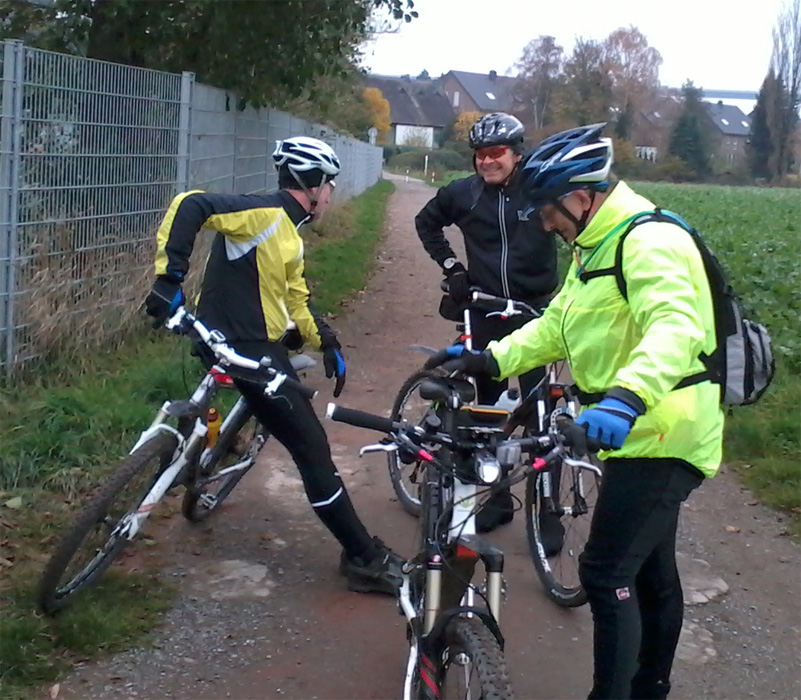 Mit ein paar Minuten Verzug bog ich (wie häufiger) auf den Startplatz an der Brücke ein und siehe da - die Sonne hatte ungewöhnlich viele Mountainbiker zum Treff gelockt. Christophs Wunsch folgend, nahmen wir die inzwischen schon traditonelle Essener Scoutrunde unter die Räder und der Vorzug des Tages war, dass immerhin 3 Guides abwechselnd die Richtung vorgaben.