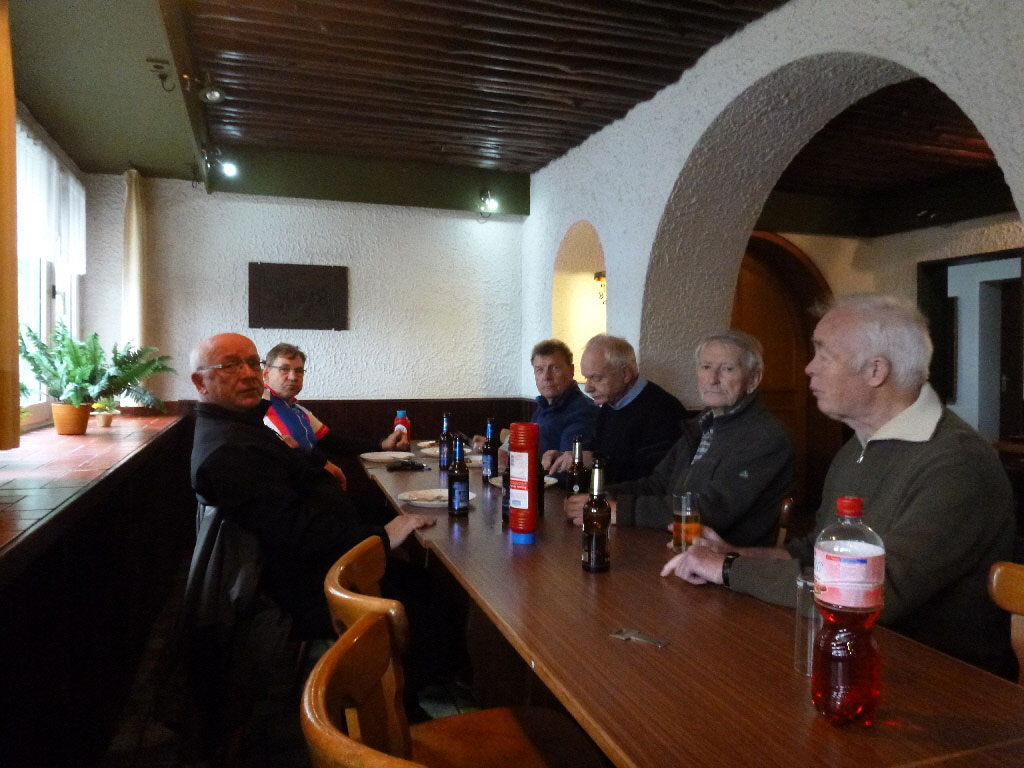 weiter von Seite 1 Manfred und Friedhelm waren so ungeduldig, dass sie sich zu zweit auf den Weg machten, während der Rest Thomas noch eine Chance einräumte, sich der Jagdgesellschaft anzuschließen. Nachdem klar war, dass Thomas doch länger brauchen würde, ging es dann auf die Pirsch im etwas ungewohnten Revier. Mit einer bunten Mischung aus Wald- und Asphaltwegen umrundeten wir das Naturfreundehaus großräumig und durften schönste Herbstansichten mit und ohne Sonne genießen. Nach rund 10 km lag der Verdacht nahe, dass die Grillspezialisten lieferfähig waren und wir kehrten zurück zum Ruhrtalhaus. Marlies hatte leckeren Kuchen mitgebracht, die Würstchen der RTF 2016 lagen auf dem Grill und der Chef vom Ruhrtalhaus hatte Grill-Fleisch und Salate bereitgestellt, die auf den Verzehr warteten. Inzwischen waren auch Thomas und einige der „fußkranken“ Mitglieder eingetroffen und wir konnten zum gemütlichen Teil der Jagd übergehen. Da das Thermometer unter 10 Grad hängengeblieben war, hielten es die Frischluftfanatiker nicht allzu lange im Freien aus. Im kleinen Gastraum war es recht gemütlich bei Bier und Saft wurde gegessen und geklönt. |