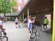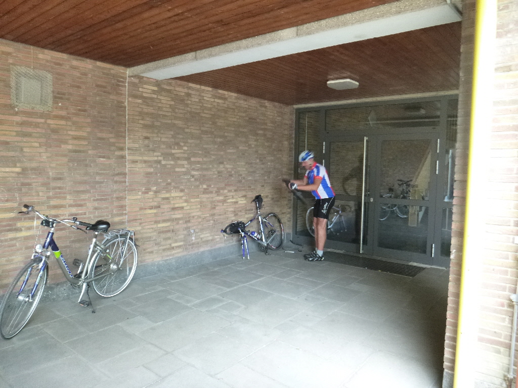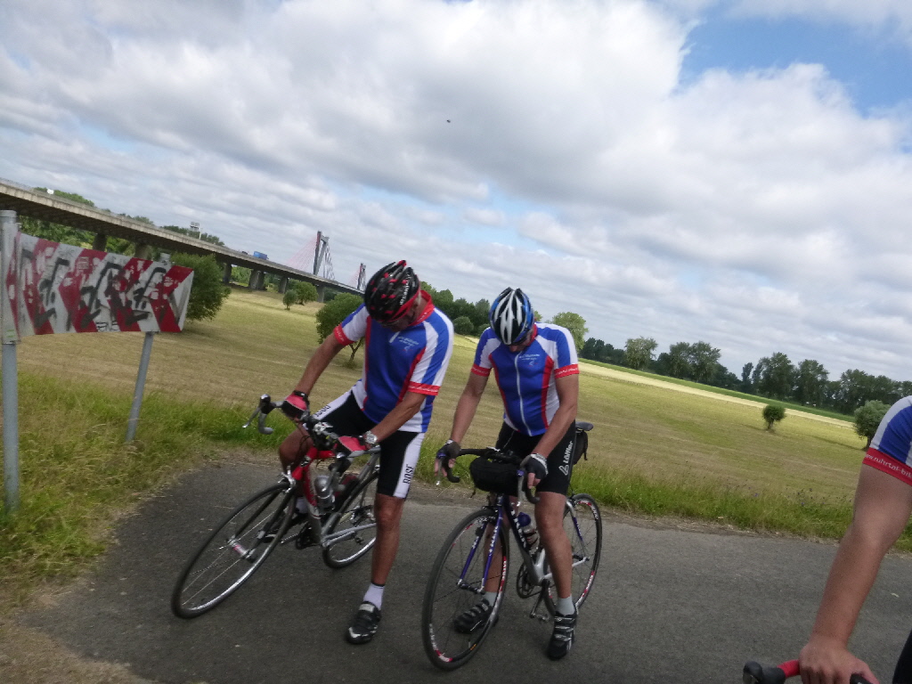 Sieben Radsportler waren am Treffpunkt und wir sammelten unterwegs noch zwei Duisburger Kollegen ein. Da ein Teil unserer Vielfahrer in anderen Gefilden im Urlaub weilte, war das eine erfreuliche Beteiligung. Bis zur Rheinbrücke führte Thomas die Gruppe an, dann übernahm Klaus T. das Kommando. Da in D-Dorf eine große Triathlon Veranstaltung unseren Weg blockierte, hatte Klaus einen Alternativplan auf dem Garmin. Sein Plan führte auf der Neusser Seite auf neuen Wegen nach D-Dorf Flehe zum Startpunkt. Unterwegs verloren wir Bernd und Friedel, die dann aber noch vor uns am Ziel waren. Als Kilometersparfreak hatte Friedel wohl noch eine schnelle Alternativroute im Köcher. Nach Anmeldungs- und Kaffee-Ritual ging es schnell wieder los. Wolfgang wechselte noch einen Schlauch am Vorderrad in einer sehr dunklen Ecke – siehe da: er kann es auch blind. Dann ging es auf Friedels Spezialstrecke zurück. Am Ende hatten wir dann 95 km bei angenehmen Temperaturen auf der Uhr. TT