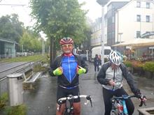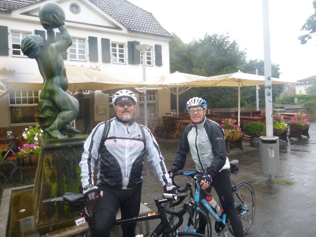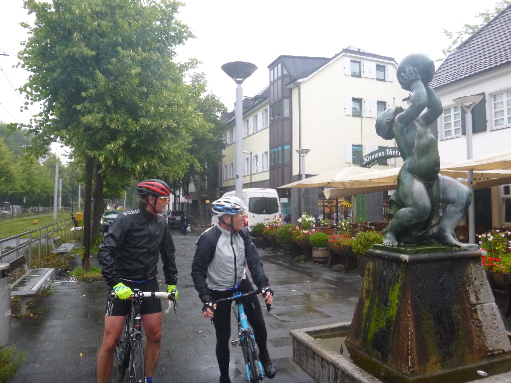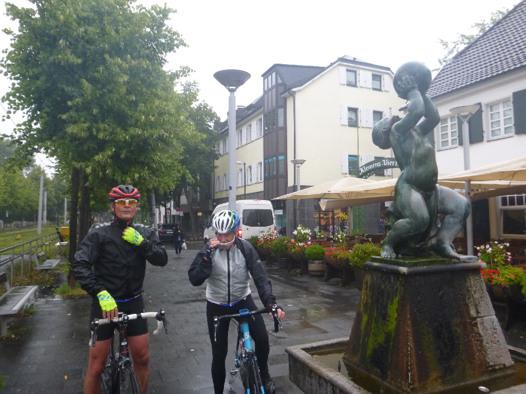 Der Anfang war moderat, weil es nur leicht nieselte. Am Treff warteten Kai-Uwe und Thomas und wir prüften kurz unseren Wunsch noch nasser zu werden. Dann ging es auf den Weg Richtung Düsseldorf. Leider verstärkte sich der Regen deutlich, nach einer Stunde wurde es zwar wieder weniger, aber die Menge Wasser in Schuhen und Kleidung war erheblich. Nach kurzer Beratung entschieden wir uns die Runde abzukürzen und das Ziel in Willich wurde gecancelt. Mit einer Schleife zum Rhein und der Fahrt durch Kaiserswerth gingen wir auf den Rückweg. So kamen nur 50 km zusammen und Thomas hatte einen kleinen Sturz zu verkraften, ansonsten war die warme Dusche nach der anhaltend kalten Berieselung sehr angenehm.