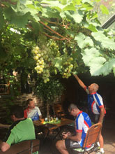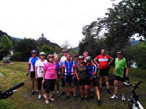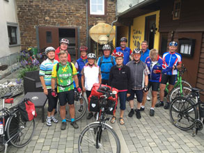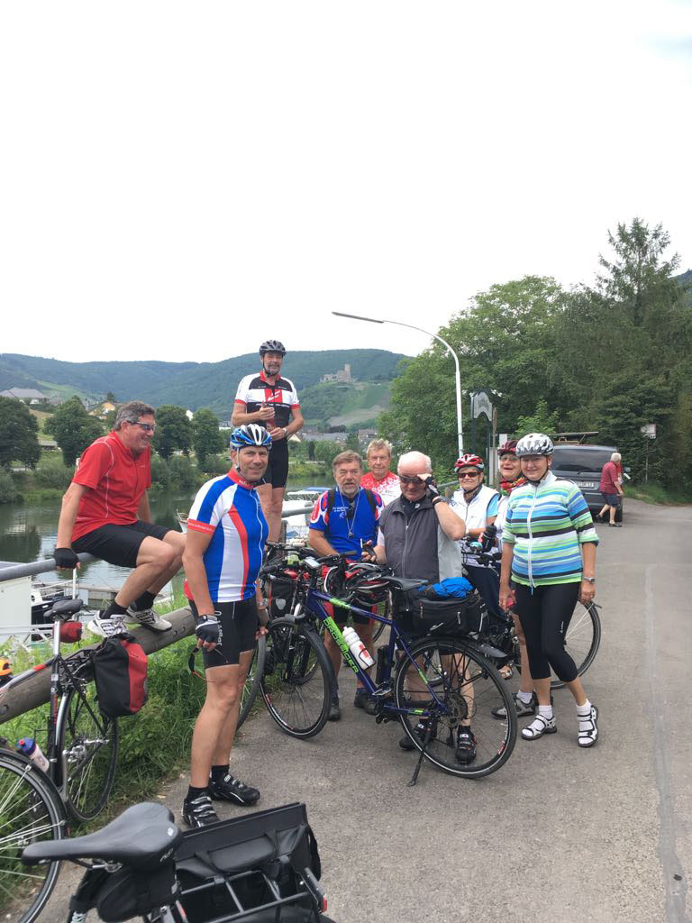 Mit 4 Radfahrerinnen und 9 Radfahrern führte der RTC Mülheim vom 14.8. - 17.8. seine diesjährige Etappenfahrt an der Mosel durch. Die Autofahrer hatten das Gepäck der Bahnfahrer mitgenommen und im Hotel in Mehring abgegeben. Von dort fuhren sie die erste Halbetappe nach Trier zum Treffpunkt in einer Weinstube am Dom. Die Bahnfahrer waren mit 10 minütiger Verspätung in Trier, weil die Deutsche Bahn im gebuchten ICE kurzfristig die Transportmöglichkeit für Fahrräder gekappt hatte, und man vom Hbf. Oberhausen kurzentschlossen einen Regionalzug nutzen musste. In netter Runde konnten die ersten Moselspezialitäten probiert werden. Bevor es gemeinsam mit dem Rad nach Mehring ging wurden der Dom, die Basilika und die Porta Nigra in Augenschein genommen. In den nächsten drei Tagen zeigte sich die Schönheit des Moseltals bei fast immer schönem Sommerwetter. Die Aussicht auf die Weinberge, die guten oft autofreien Radwege, die niedlichen kleinen Ortschaften an der Mosel und die Burgen auf den Moselhöhen trugen zu einem beeindruckenden Freizeiterlebnis bei. Als kulturelle Höhepunkte seien das Normagener Weinschiff aus der Römerzeit, die Klosterbrauerei Machern und das Dörfchen Edinger-Eller mit seinen Häusern aus dem 17. Jahrhundert und dem Winzergut mit seinem idyllischen Innenhof unter Weinlaub genannt. Als störend wurden der große Rummel in Bernkastel-Kues und Cochem empfunden. In Bernkastel-Kues erwischte die Gruppe auch der einzige kurze Minischauer. Es gab schöne Hotelunterkünfte in Mehring, Traben-Trarbach und Treis-Karden mit Halbpension und leckeren moseltypischen Gerichten. Natürlich fehlte auch der Moselriesling nicht. Bei einer Weinprobe im Weingut Knaup konnten alle am vorletzten Abend testen, ob denn nun der trockene, halbtrockene oder liebliche Riesling am besten mundete. Mancher bevorzugte aber lieber den roten Dornfelder von der Mosel oder einfach das Bier aus Bitburg. Am Mittag des letzten Tages erreichten alle wohlbehalten nach rund 250 Kilometern die Mündung der Mosel in den Rhein und das Deutsche Eck in Koblenz. Eine wunderschöne mit Unterstützung der Mosellandtouristik durchgeführte Radtour in einer Gruppe, deren Mitglieder sich sehr gut verstanden hatten, war zu Ende. Eine gebrochene Speiche, ein kleiner Sturz und ein Wadenkrampf waren zum Glück das Schlimmste, was passierte. Die Bahnfahrer fuhren von Koblenz nach Hause, während die Autofahrer mit dem Zug und dem Rad ihre Autos aus Mehring und das Gepäck aus Treis-Karden abholten, bevor es nach Mülheim ging. (Wort und Bild MK) |