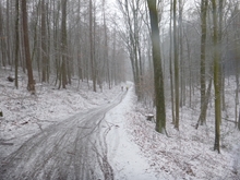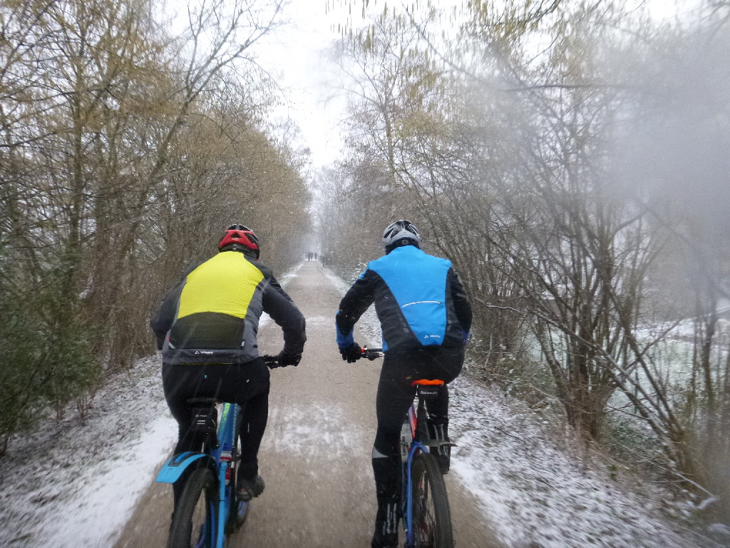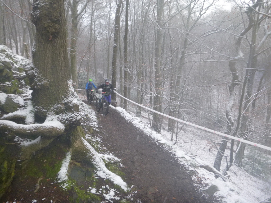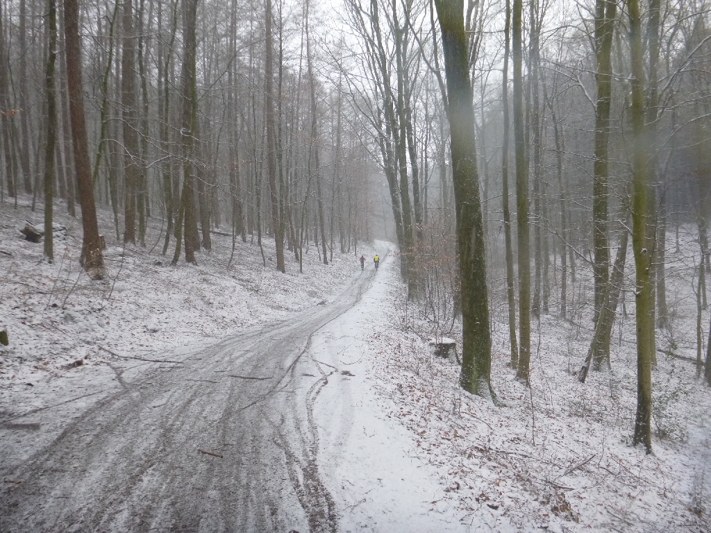 Witten liegt in passabler Nähe, also Auto packen und dann via A40 mit geringem Verkehr nach Osten. Vor Ort in Witten wurde die Wettervorhersage eingelöst und es schneite in kleinen lockeren Flocken. Wir starteten gemeinsam und die leicht verschneite Landschaft war nett anzusehen. Auf Trails und Wegen hatte das aber den Effekt, dass das Geläuf schmierig und bisweilen recht tief und schwer wurde.