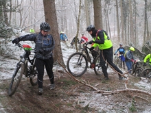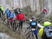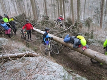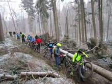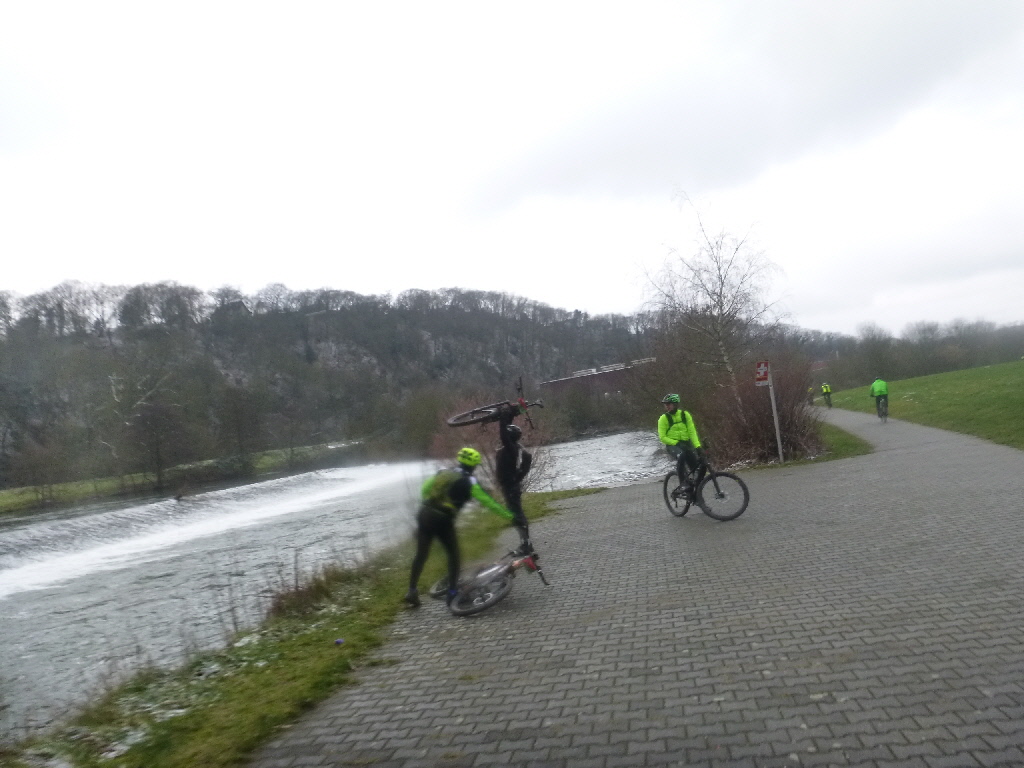 Die Wittener Strecke hat zu Beginn einige Bergauf- und Waldpassagen und da Thomas sichtlich bemüht war, ließen wir Marius ziehen und fuhren moderater über die Runde. Die Räder gewannen deutlich an Gewicht und glichen sich farblich dem Waldboden an. Eigentlich war die Langstrecke auf dem Programm, aber wir einigten uns auf die kürzere 46 km Runde, was aber der Tour etwas den Pfiff nahm, denn in der 10 km Schleife liegen schöne Trails und wir vermissten die Fahrt durchs Muttental mit den Bergbau-Erinnerungen.