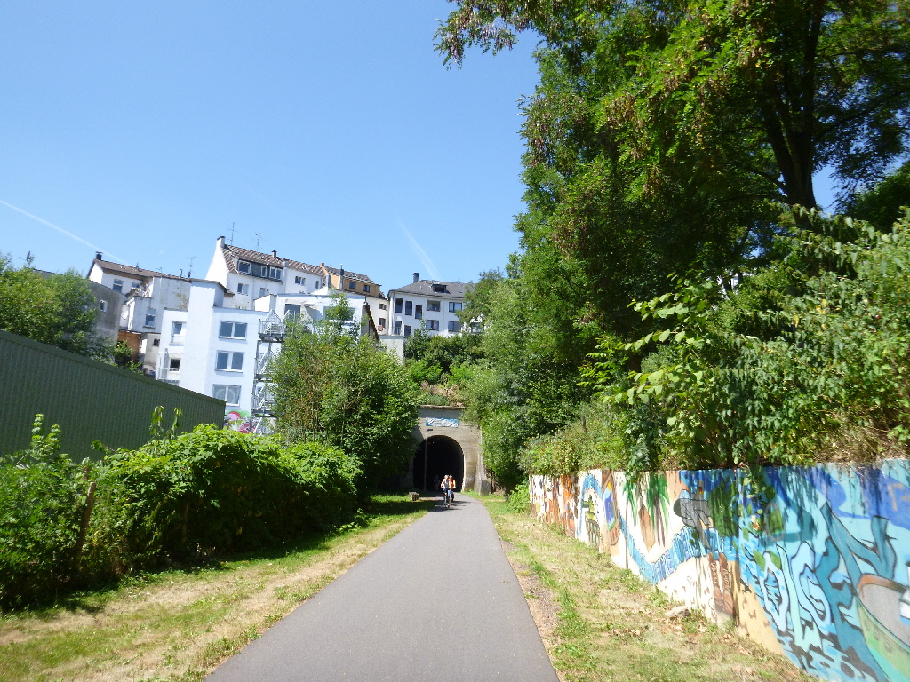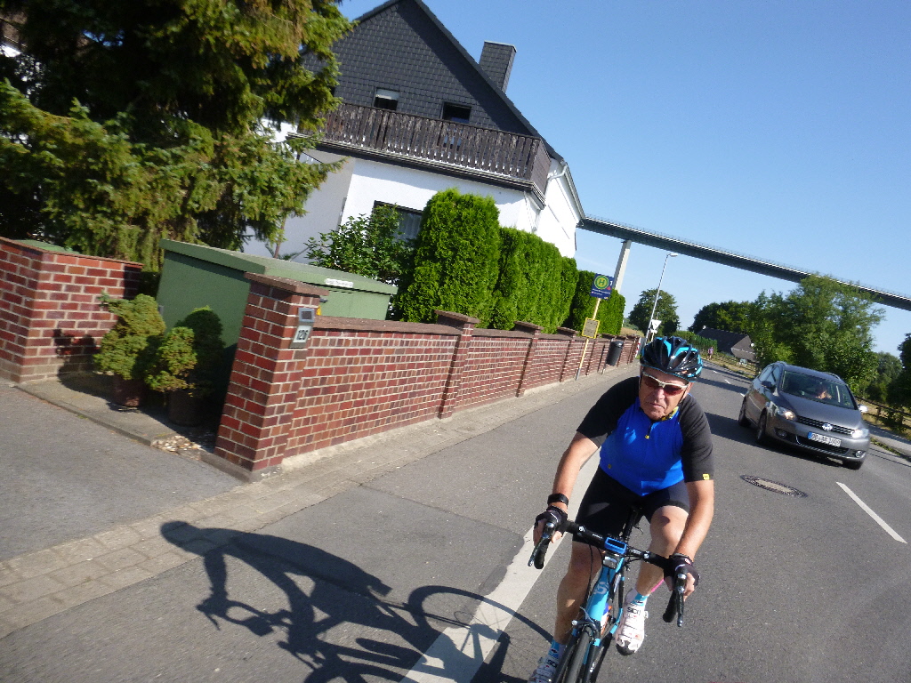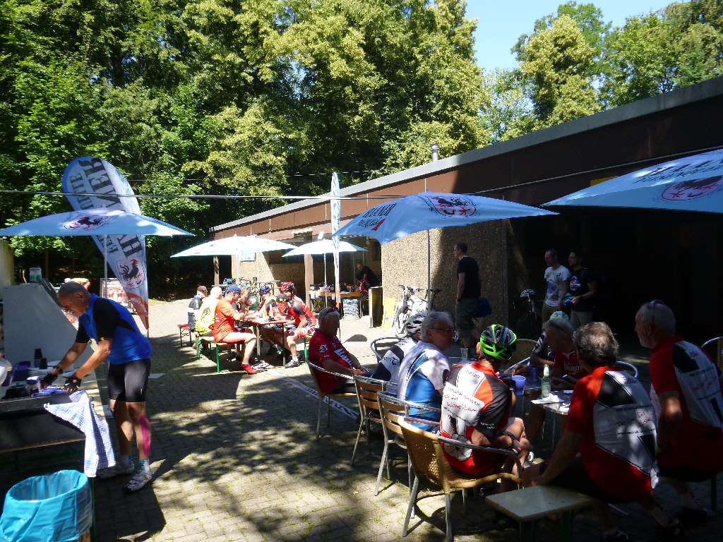 Mit Scan&Bike ! Und sie waren erfolgreich. Bei schönem Wetter kamen rund 340 Radsportler und alle waren hocherfreut. Neben dem Hardware-Einsatz hatten wir uns den Besuch in Solingen vorgenommen und starteten eine wunderschöne Trassenrunde. Nach Solingen ist die Tendenz aufwärts und es kommen rund 600 Höhenmeter zusammen. Hauptsächlich folgt man dem Panorama-Radweg und der Korkenziehertrasse. Vor Ort herrschte Gartenlokal-Atmosphäre. Thomas zeigte Geduld, weil die Herstellung seiner Bratwurst viel Zeit in Anspruch nahm, dafür lag sie ihm auf dem Rückweg auch schwer im Magen. Der Kuchen war auch lecker und leichter verdaulich. Die Besichtigung der Radrennbahn lieferte noch ein paar verwertbare Bilder und dann ging es auf dem gleichen Weg zurück – da wurden es dann nur 400 Hm und wir waren schneller unterwegs, allerdings war auf den Trassen deutlich mehr Verkehr. An der kleinen Kaffeeröstrei mit dem Eisenbahnwaggon auf dem Panoramaradweg nahmen wir einen Cappuccino und erfreuten uns an den stattlichen Gästen mit Lust auf Kuchen. Rund 120 km kamen zusammen und wir waren recht lang unterwegs. Aber, der Weg ist das Ziel und weniger die Punkte – auch wenn wir sie heute mitgenommen hatten. km
