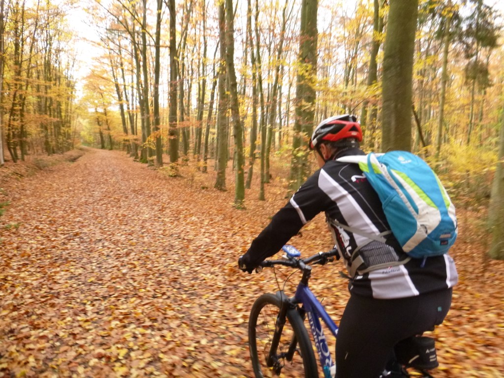 Endlich Herbst: Die Farbenpracht der Wälder in diesen Novembertagen beeindruckt. Und diese Farben schmeicheln den Augen in zahllosen Schattierungen und hinzu kommt der dezente Regen, der uns an beiden Tagen begleitet hat – ohne zu unangenehm zu wirken, denn die Temperaturen blieben moderat. Als echter Herbststart wurden wir daran erinnert, dass ein November kalt und nass zu sein hat – das hat er bedingt geschafft und wir haben uns dabei ganz wohl gefühlt. Am Samstag hatte Thomas einen alten Track ausgegraben, der uns über Lintorf, Eggerscheidt und Hösel durch die Herbstwälder führte. Schöne Trailpassagen sorgten für Fahrspaß, wobei die Blätterteppiche die manchmal recht rustikalen Streckenführungen ganz gut verdeckten. Am Sonntag warteten wir vergeblich auf Kai und fuhren dann erneut zu zweit los. Die Richtung war Kaiserswerth, aber wir veränderten die Route, weil Sturm und Regen angekündigt waren, also hielten wir uns in den Waldregionen und der Weg führte uns wieder nach Lintorf und im Bogen über Hösel heimwärts. Im Ruhrtal-Casino wurde die Weihnachts-Deko ausgepackt, unser Kaffee war aber wieder frisch gebrüht und lecker. Thomas genoss auch ein gepflegtes Stück Kuchen und wie am Vortag begleiteten uns ein paar Regentropfen auf den Kilometern nach Mülheim – moderat und erträglich. km |