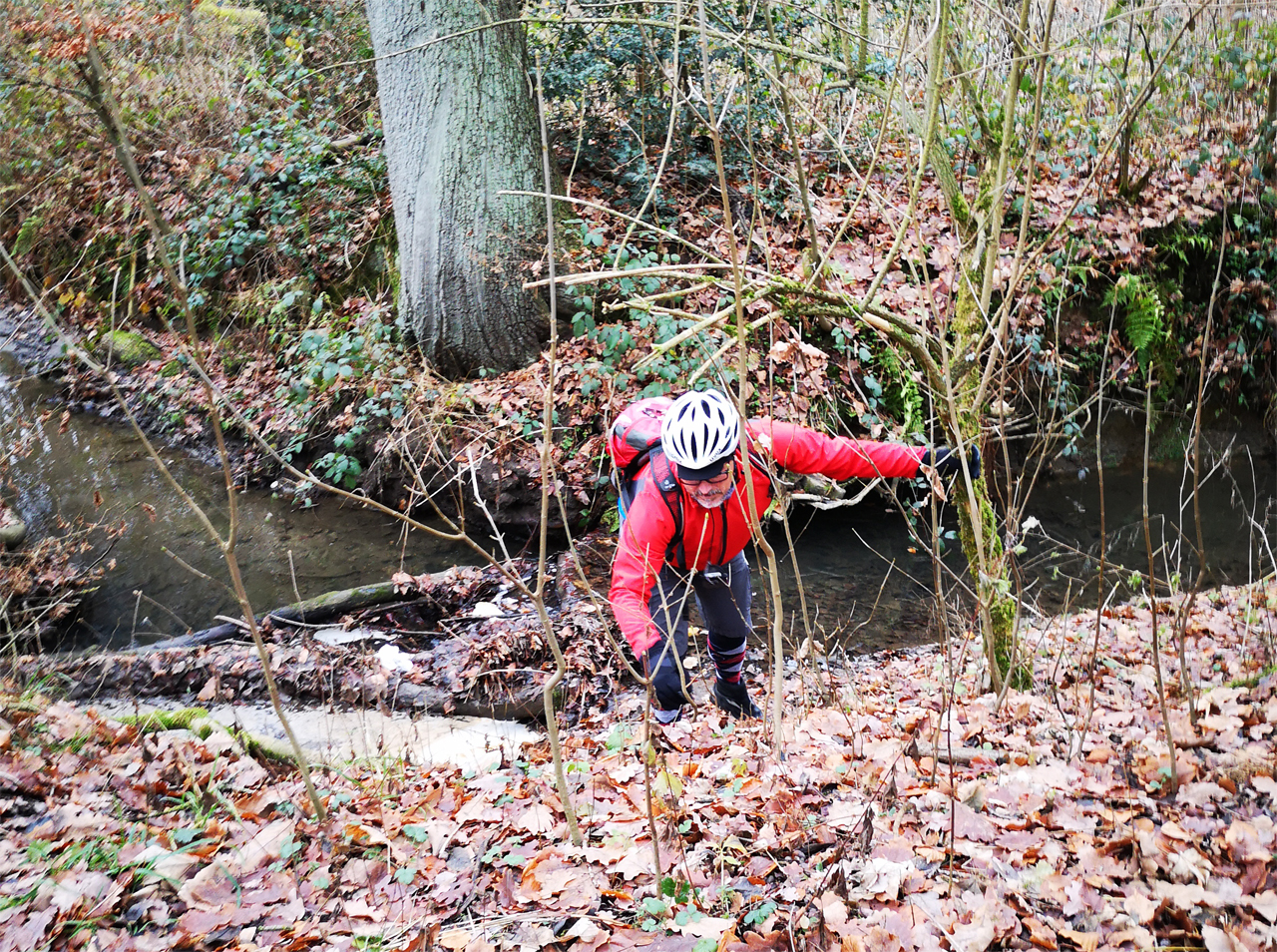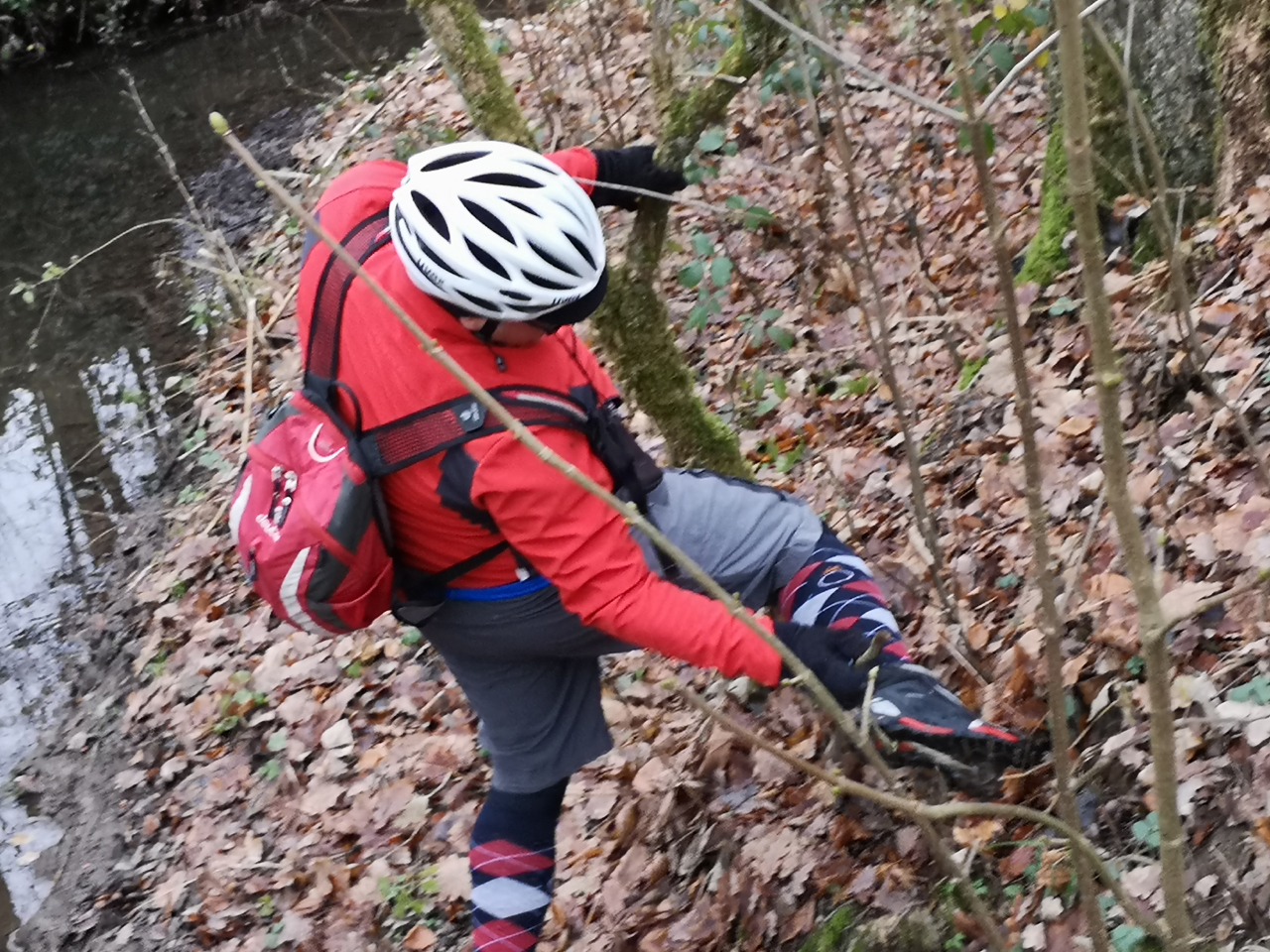 Am Treff waren wir zwar beide etwas spät, aber es führte wohl nicht zu vereinsamten Gastfahrern. Bei Temperaturen um Null Grad war es wichtig sich gut zu bewegen. Wir verfolgten den zuletzt getesteten Weg nach und durch Essen. Im Rumbachtal folgte Thomas seinem neuen Hobby und fand die kleinen Sprengsätze der geliebten Hundemeute. Wie schön, dass es den Rumbach gibt, den Thomas dann zum „Ausbaden“ der braunschleimigen Treffer nutzte. Halbwegs gesäubert sammelten wir einige Höhenmeter in die Essener Richtung und am Ende kamen wir in Werden wieder aus. Der Versuch, die frostige Runde im Ruhrtal-Casino zu beenden schlug fehl, da eine „geschlossene Gesellschaft“ den Eintritt verwehrte. Alternativ gab es Kaffee und Kuchen im Kloster-Café – durchaus lecker und auch angenehm zum Sitzen. Schöne, aber auch ziemlich kalte Runde mit 600 Hm und 50 Kilometern. km