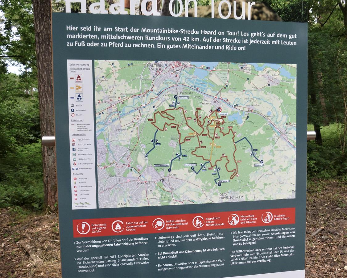 In den letzten Jahren wären wir an diesem langen Wochenende im Schwarzwald oder in der Eifel auf Tour gewesen. Die Corona-Alternative war eine Tour durch die Haard. Rad-Revier-Ruhr hat in Verbindung mit Vereinen und Sponsoren eine 42 km lange MTB Runde ausgeschildert, die kreuz und quer durch die Haard führt und offiziell als MTB-Strecke ausgewiesen ist. Thomas, Brigitte und ich hatten den Plan und wir trafen uns in Haltern-Flaesheim. Die Anfahrt mit knapp 60 km ist vertretbar, das Verkehrsaufkommen (trotz Baustellen) ist überschaubar und in rund 45 Minuten waren wir vor Ort. Unterwegs bewegte Brigitte das Problem rustikaler MTB-Trails, aber die Strecke machte am Ende 100 % Spaß und 0 % Angst. Es war an so einem Feiertag einiges los und der Parkplatz war bereits überfüllt, als wir um 11:30 Uhr am Start eintrudelten. Thomas hatte aber schon Pfadfinder gespielt und wir fanden Parkmöglichkeit nahe beim Sportplatz und das war sogar angenehmer, weil weniger frequentiert. Es war schon fast wie im CTF-Betrieb. Teile der Strecke waren noch in Erinnerung, denn die Haard-Biker haben ja hier über viele Jahre ihre CTF durchgeführt. Die Streckenführung ist wirklich toll, nicht schwer aber über viele schöne Trails. Es kommen knapp 600 Hm zusammen, was mit der Unterstützung auf den Bikes von Brigitte und mir sehr unproblematisch war – mein Akku war allerdings am Ende doch gut ausgesaugt. Thomas hatte am Ende etwas zu kämpfen, aber er kam gut über die Strecke. Die lobenswerte Tourismus-Idee hat einige Vorteile. Die Fahrtrichtung der Strecke ist definiert, also hält sich Gegenverkehr in Grenzen. Wanderer müssen den Vorrang der Biker berücksichtigen, damit sind Beschimpfungen weitgehend vom Tisch. Wir sind sehr wohl der Meinung, dass der Wald für alle da ist und berücksichtigen das, aber es ist auch angenehm, der bevorzugte Nutzer der Strecke zu sein. Und es waren viele Biker auf der Strecke, mal wird man überholt, mal schließt man zu Radkollegen auf – es kommt fast etwas wie Veranstaltungsfeeling auf.Die 42 km sind korrekt, die Ausschilderung ist gut gemacht, wobei wir eine Mischung aus GPS-Führung und Beschilderung bevorzugen und dann klappt alles prima, weil nach dem Abzweig eine Bestätigung am Baum hängt, die dir sagt, es war der richtige Weg. |