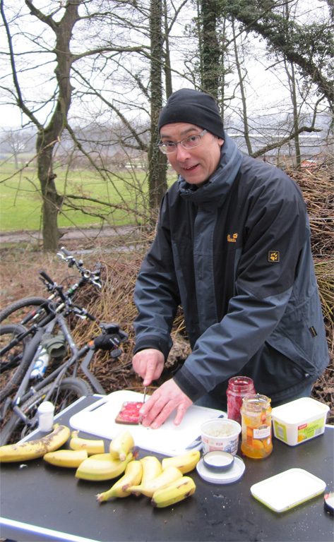 Natürlich war es tatsächlich kalt, aber die Sonne strahlte und die Aussichten waren schlicht toll auf den ersten Anhöhen der Runde. Allerdings kämpften Felix und Thomas nicht nur gegen die Kälte sondern auch gegen zuviel Luft im Reifen, streikende Pulsmesser, Thermosflaschen mit defekten Trinkanschluss und anderes mehr. Insofern erreichten wir das Ziel mit leichter Verspätung, aber gut ausgelastet und wohl auch gut gelaunt.