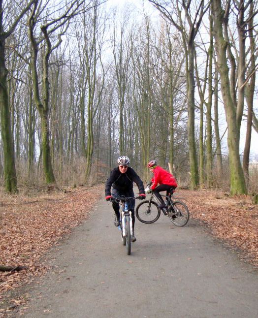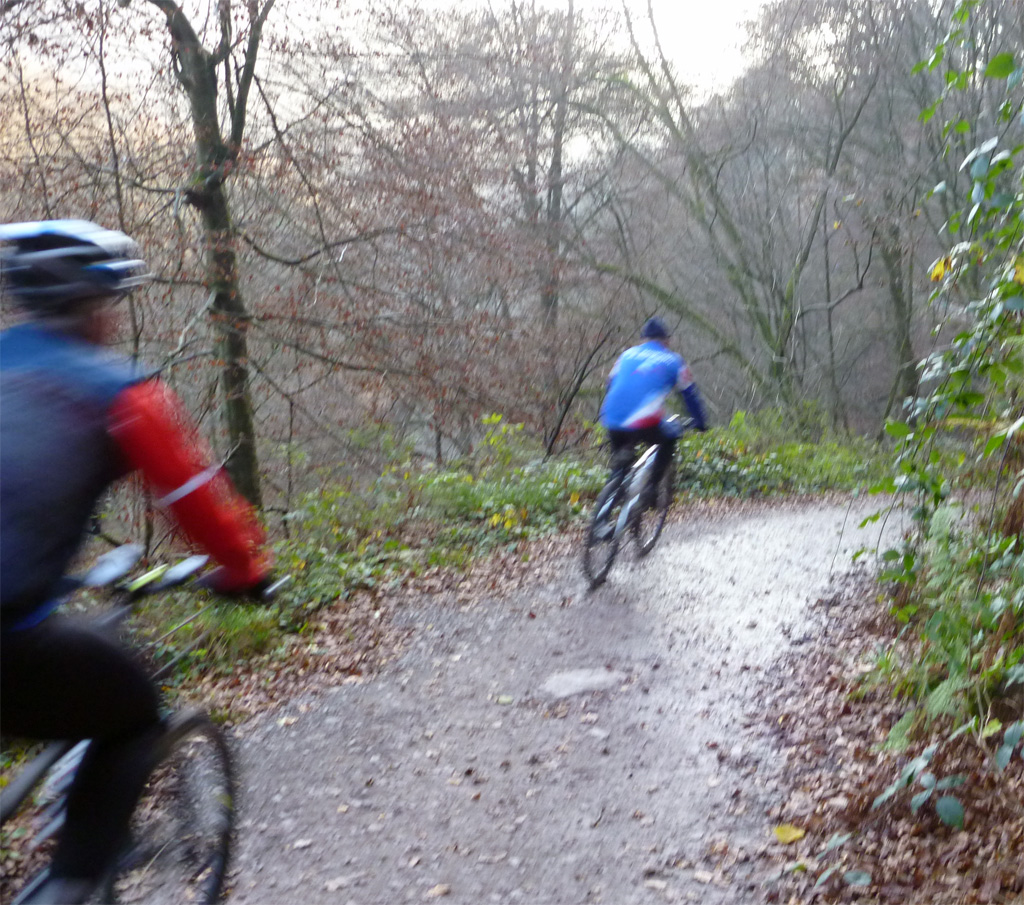 Ab Gashaus waren wir zu Fünft, Thomas und Felix, Ich , na klar und Reiner und Friedhelm gesellten sich dazu. Flach bis nach Kettwig und von da folgten wir der guten Ausschilderung zur Margarethenhöhe. Ein paar giftige Anstiege hatten die Krayer eingebaut - zur Freude von Thomas - wir bewältigten sie aber souverän und hätten uns nur ein paar wärmende Sonnenstrahlen gewünscht. Die Streckenführung war gelungen und landschaftlich richtig schönes Essener Hochland. Reiner und Felix kämpften bisweilen gegen oder mit Kette und Schaltung, da das Gelände von zügigem bergab schnelle Schaltwechsel nach ruppig bergauf verlangte, aber die kleinen Pausen kamen dann Thomas zugute. Beim Hof Tüschen grummelte der Bauer gegen die Pfeile, die die Krayer mit Farbe auf den Boden gemalt hatten. Wir stellten fest, dass er mit grosser Sorgfalt die Ausschilderung auf seinem Grund und Boden entfernt hatte und hofften, dass die späteren Kollegen nicht zu unnötigen Umwegen veranlasst würden.