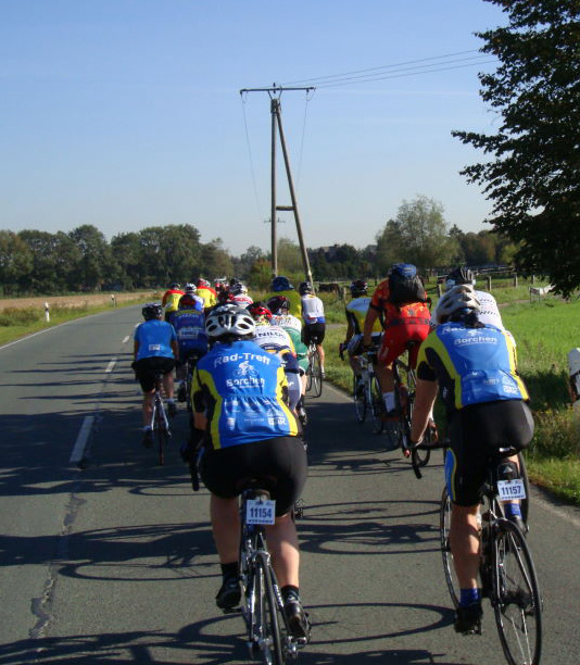 12 motivierte Fahrer des RTC sammelten sich am Treff Kölner/Luxemburger Straße. Es ging pünktlich und auch ganz locker los. Schnell waren wir am Start in Ratingen, noch schneller angemeldet. Die Gruppe teilte sich - einige gingen auf die kleine Runde, der Rest fuhr mit Schleifchen wieder heimwärts. Felix, Hansi und ich wollten etwas flotter auf die Strecke, gesagt und nicht getan, denn just in dem Moment als Felix antrat, hatte er einen Platten am Hinterrad. Also absteigen statt antreten, Schlauch wechseln statt rollen. Zu Dritt kümmerten wir uns nun erstmal um Felix' Hinterrad, während die anderen schon mal die Strecke inspizierten. Als der Job erledigt war, fanden wir eine schnelle Gruppe an die wir uns hängten. Doch richtig weit kamen wir nicht - dummerweise hatte ich wohl Felix' Satteltäschchen nicht richtig geschlossen, beim kräftigen Treten, machte sich das Werkzeug selbständig und der flotte Ritt war schon wieder beendet: Anhalten, umdrehen, einsammeln, drei kleine Worte, viel Zeitverlust. Die schnelle Gruppe war weg, also fuhren wir bis zur ersten Kontrolle ein kleines Teamzeitfahren, mit dem Erfolg, dass die erste Gruppe des RTC gerade wieder auf die Strecke ging, als wir unsere Startkarten abstempeln liessen. Pause gestrichen, Lücke zufahren, und danach locker gemeinsam zum Ziel rollen. Nach den Mühen des Tages schmeckte der Kuchen um so besser und zu Hause standen dann 80 km und 480 Hm auf der Uhr.