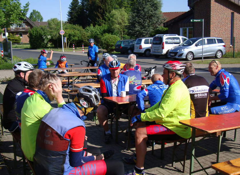 Nun ja, die meisten Radsportler sind keine klassischen Vatertagstypen, aber ein Feiertag ist eine gute Gelegenheit für eine Zusatzrunde unter der Woche. Also war der Andrang grösser als z.B. am letzten Sonntag. In zumeist schöner Zweierreihe begleitete die Sonne die Mülheimer Radler nach Issum und wieder zurück. Nur wenige nahmen vor Ort noch eine Runde unter die Räder.
