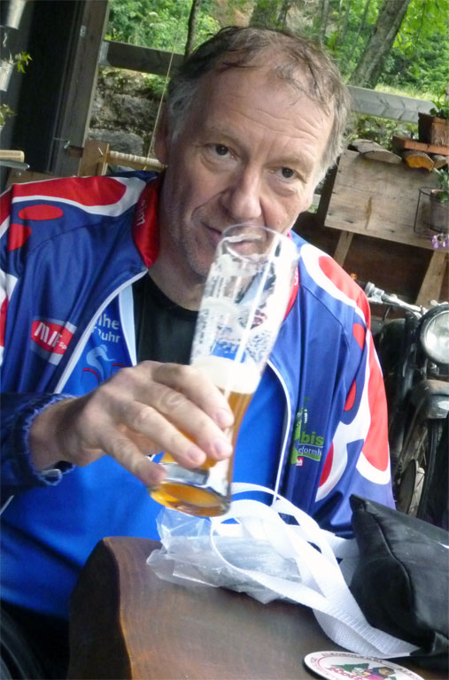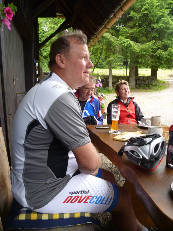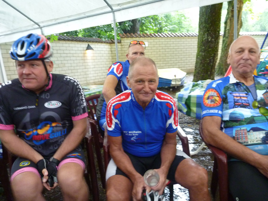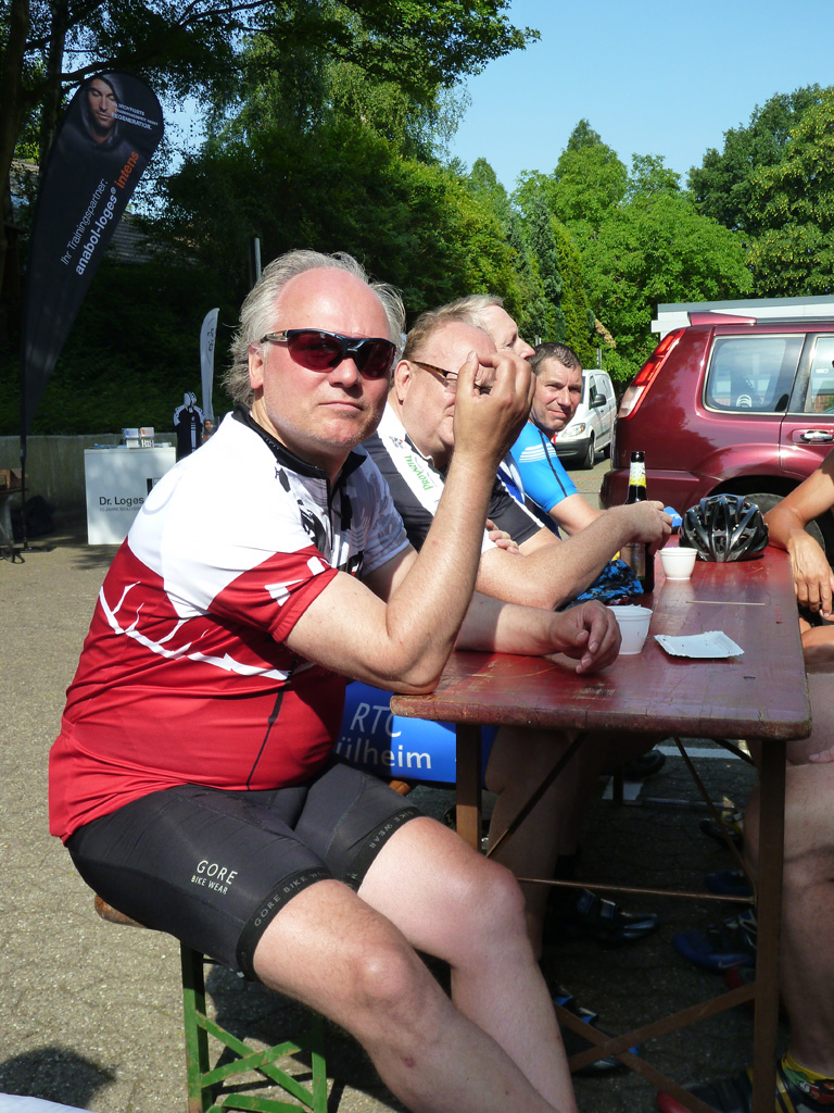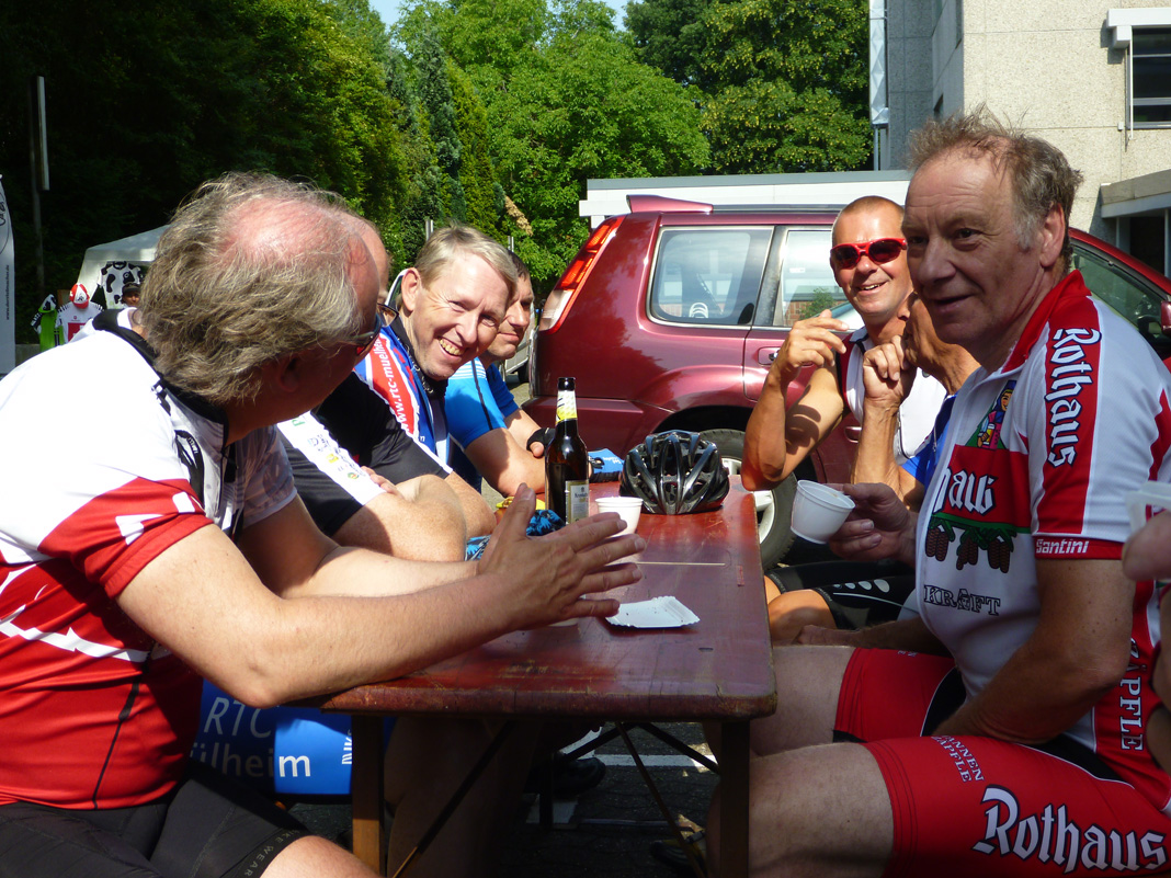 Aus der Vorsuppe fischten wir noch Lothar und Wolfgang. Beide waren natürlich eingeladen das Mahl mit uns zu teilen. Lothar hatte noch dicke Beine von gestern und mit der Vorsuppe genug, wir sollten schon mal vorfahren. Nach der Kontrolle hatte ich leichte Probleme wieder richtig in Tritt zu kommen und sagte den Mitstreitern dass sie nicht auf mich warten müssten. Das brachte sie allerdings um den Nachtisch, da sie schon zu Hause waren, als unterwegs feucht aufgetischt wurde. Gut gesättigt, nach 130 km und 395 Hm war dann alles verputzt.