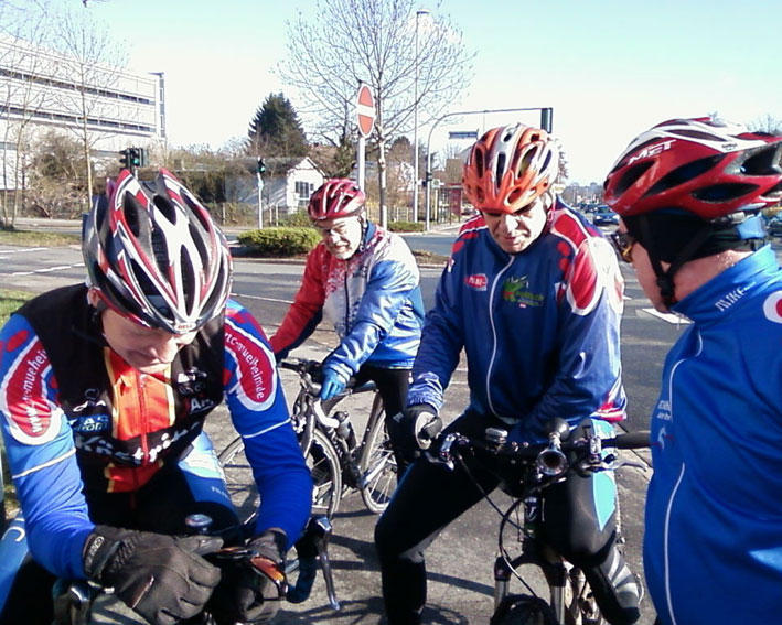 Mountainbike-Treff MülheimDas Ende der winterlichen Ausfahrten ist absehbar. Am Samstagstreff MTB sammelten sich 8 Biker, sogar der RTC-Vorsitzende war -wohl zur Prüfung der Zahl der Starter- angereist, denn mit dem Start der Runde entschwand er mit der Besten seiner Ehefrauen mit unbekanntem Ziel. Die verbleibende "wilde" 6 folgte Otti durch Feld und Wald, das Wetter spielte mit und eine wirklich schöne Runde kam dabei heraus -(siehe Anhang) - nicht zu schwer, um auch den Neueinsteigern den Start in die Saison moderat zu gestalten und landschaftlich abwechslungsreich, bisweilen sogar mit sonnigen Aussichten. Den Kaffee gab's am Entenfang, wobei das Büdchen durch Rudelbildung der rauchenden Zunft auffiel. Von da war's nicht mehr weit nach Hause und knapp vor den ersten Regentropfen hingen die Räder wieder am Haken.