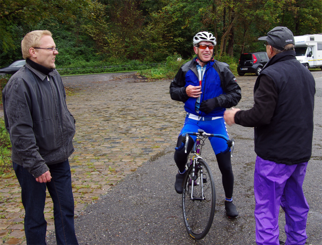 Auch Prominenz zeigt sich und kümmert sich um die kleinen Highlights - Marcel Wüst erklärte, wie die kleine Notdurft so dicht am Rad wie möglich am elegantesten zu erledigen ist - man lernt halt immer noch dazu. Wobei Marcel Wüst ein sehr angenehmer Radsportbegleiter