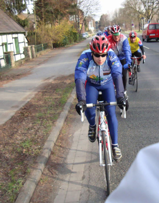 | Mein Kaffee stand noch in der Tasse, mein Kuchen war noch nicht ganz aufgegessen, ja, was kommt nun? Richtig: Die Männer standen schon Füße scharrend an ihren Rädern. Der eine oder die andere (ich) mussten aber noch mal zur Toilette und wir wollten auch keinen Streß aufkommen lassen. Also, und das passte auch alles super, teilte sich die Gruppe in Absprache in drei kleinere Gruppen auf. Somit war sichergestellt, dass niemand alleine nach Hause fahren musste. Unterwegs begegnete uns noch Friedhelm E. kurz vor dem Ziel, den wir schon vermisst hatten. |