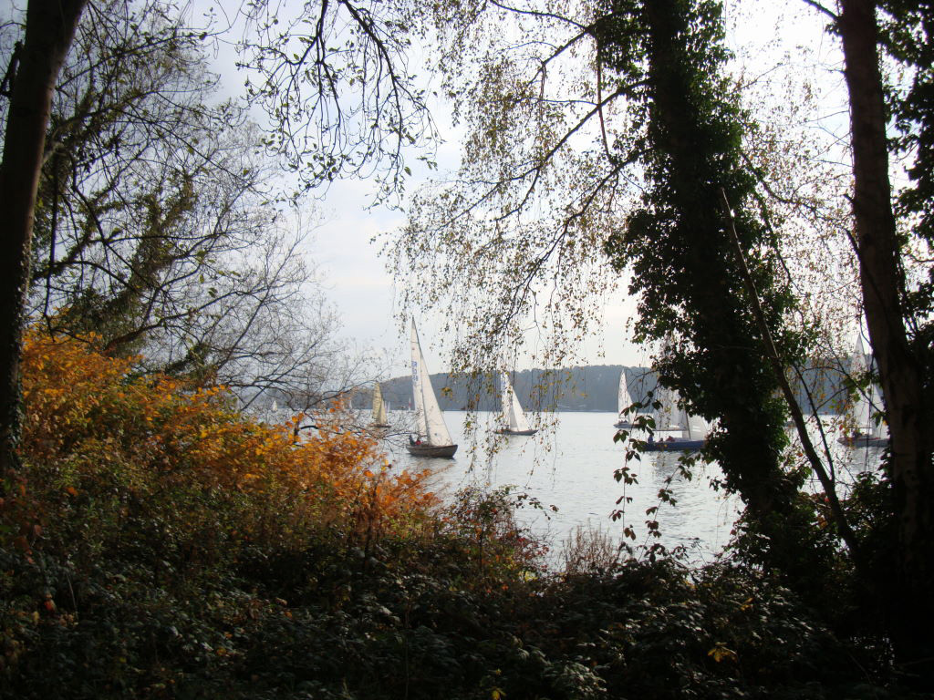 Wie gesagt, wir pflegten den Separatismus und pflügten über Auberg und Ruhrhöhe gen Kettwig und bogen dann auf die Seerunde ein. Egal, ob rechts oder links waren die An- und Aussichten toll, farbenfroh im Licht der Herbstsonne konnte gar keine schlechte Laune aufkommen. Nicht nur rund um den See, sondern auch auf dem Wasser war Action angesagt- bei wenig Wind waren die Segel der Regatta zahlreich. Der Rückweg führte uns übers Reiter-Casino an der Mintarder Brücke, wir sammelten die letzten Sonnenstrtahlen bei Kaffee und Streuselkuchen ein und waren für das Sonntagsmenü nicht zu spät zu Hause. km/TT Munterer Start in den MTB-Winter