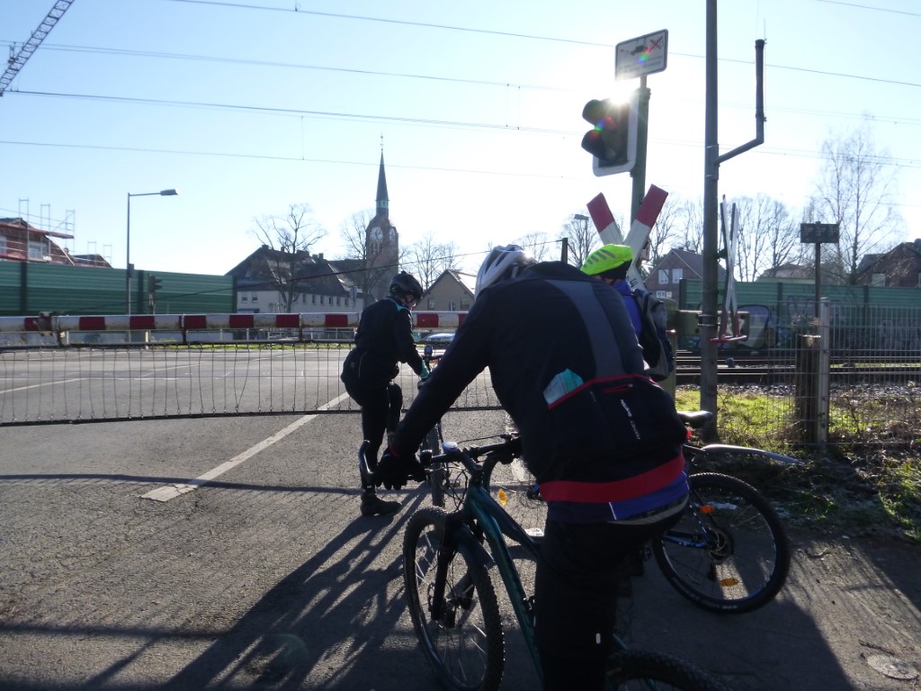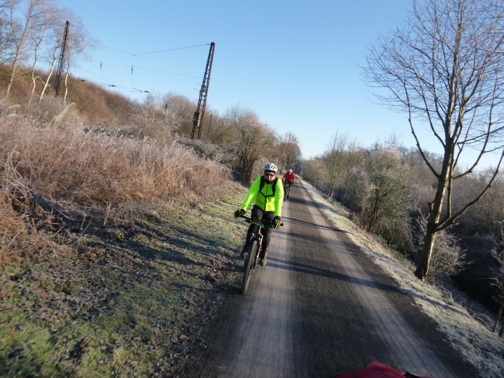 Am Morgen musste ich dann nicht ganz so früh aus den Federn, dank der guten Vorbereitung war das Auto schnell beladen und nach kleinem Frühstück musste ich nur noch die Seitenscheiben vom Eis befreien. Unter Vermeidung der A3 setzte ich mich Richtung Dortmund in Bewegung. Kurz hinter Bochum kontrollierte ich im Kopf nochmal meine Reiseutensilien und mich beschlich das ungute Gefühl doch nicht alles eingeladen zu haben. Irgendwie konnte ich mich nicht erinnern, das Vorderrad verstaut zu haben, es braucht immer eine gewisse Sorgfalt um das Vorderrad sicher und fest abzulegen. Der Kontrollblick nach hinten bestätigte meinen Verdacht. Ohne Vorderrad war die Aktion zum Scheitern verurteilt, als Wheely 50 km durch den Wald zu fahren war aussichtslos, es blieb nur die Umkehr. Auf der A40 stand der Verkehr auf der Rückfahrt hinter Essen. Nach 15 Minuten Verzögerung verließ ich die Bahn ab Holsterhausen und wurstelte mich etwas mühsam heimwärts. Angesichts des Bilderbuchwetters ärgerte ich mich, vervollständigte zu Hause dann aber das Rad und entschied mich für eine Privatrunde Richtung Rhein, um noch möglichst viel Sonne einzufangen. Trotz des Ärgers fuhr es sich sehr angenehm. Die ersten 2 km waren für die Nase mit eiskalten Nadelstichen noch unangenehm, aber nach der Gewöhnung ließ es sich wunderbar fahren. Ganz allein war ich selten, zahllose Hundemeuten mit Menschenbegleitung und ein Biker, der in einer eisigen Kurve verunglückt war, sorgten für Abwechslung. Wenn sich das Wetter hält, ist das Debüt auf der WWBT nun auf Waltrop verschoben. (km)