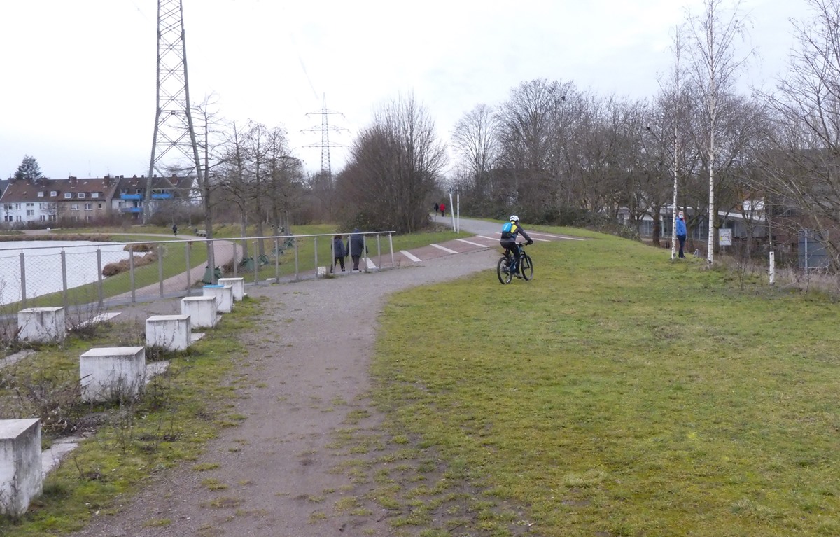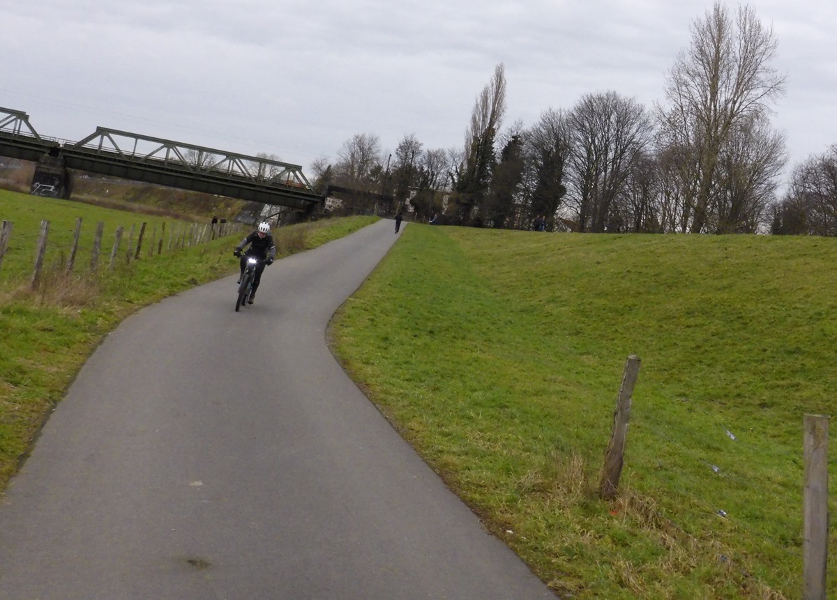 Egal, am Samstag folgten wir der RS1-Trasse Richtung Essen, kontrollierten den Baufortschritt an der Brücke kurz hinter Altenessen und nahmen dann Kurs auf Haus Ripshorst. Am Rhein-Herne-Kanal fuhren wir wieder Richtung Heimat. Wir bewunderten die Frachtschiffe an der Schleuse die Zentimetergenau die Schleusenbreite ausfüllten. Am Ruhrufer unterhalb der Eisenbahnbrücke hatte die Ruhr den Radweg überflutet. Die Durchfahrt brachte etwas Wasser in den rechten Stiefel, weil man die Passage nicht ohne Treten durchqueren konnte. Der Rest blieb trocken und die Motoren verkrafteten den feuchten Zugriff. Am Sonntag war wieder die Südroute angesagt und wir machten uns zu Dritt auf den Weg. Wir mieden die Nähe zu großen Parkplätzen, die in der Regel besonders viele Spaziergänger ausspucken und kamen ganz gut über Wege und Trails. Brigitte machte ungeplant Bekanntschaft mit einer schmierigen und ziemlich großen Pfütze und wir sahen dann zu, zügig heimwärts zu kommen. Eine ebenfalls ungeplante Begegnung mit einem „uralten“ Bekannten sorgte für zusätzlichen Gesprächsstoff. Mit knapp 40 km Strecke haben wir den Sonnenschein doch angemessen genutzt. km |